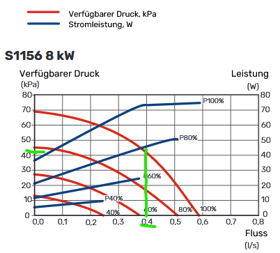 Im Datenblatt habe ich gefunden dass die WP WP [Wärmepumpe] einen max Durchfluss von 1,36m³/h bei max benötigt was 0,377l/s entspricht. Wenn ich das Richtig aus dem Diagramm lese dürfte man dann einen maximalen Durckverlust von etwas über 40kPa haben = 0,4 Bar