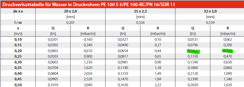 Berechnung Druckabfall für Wasser: