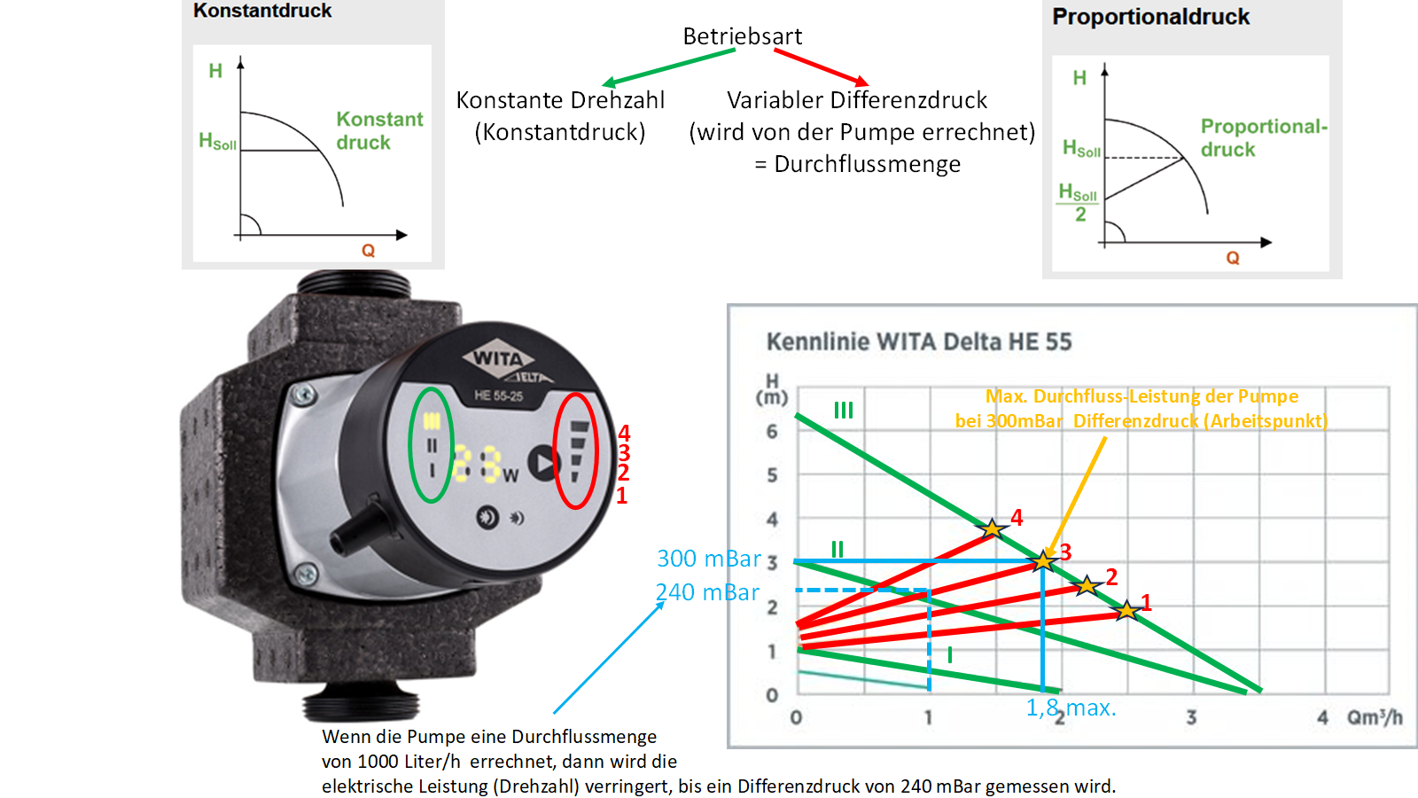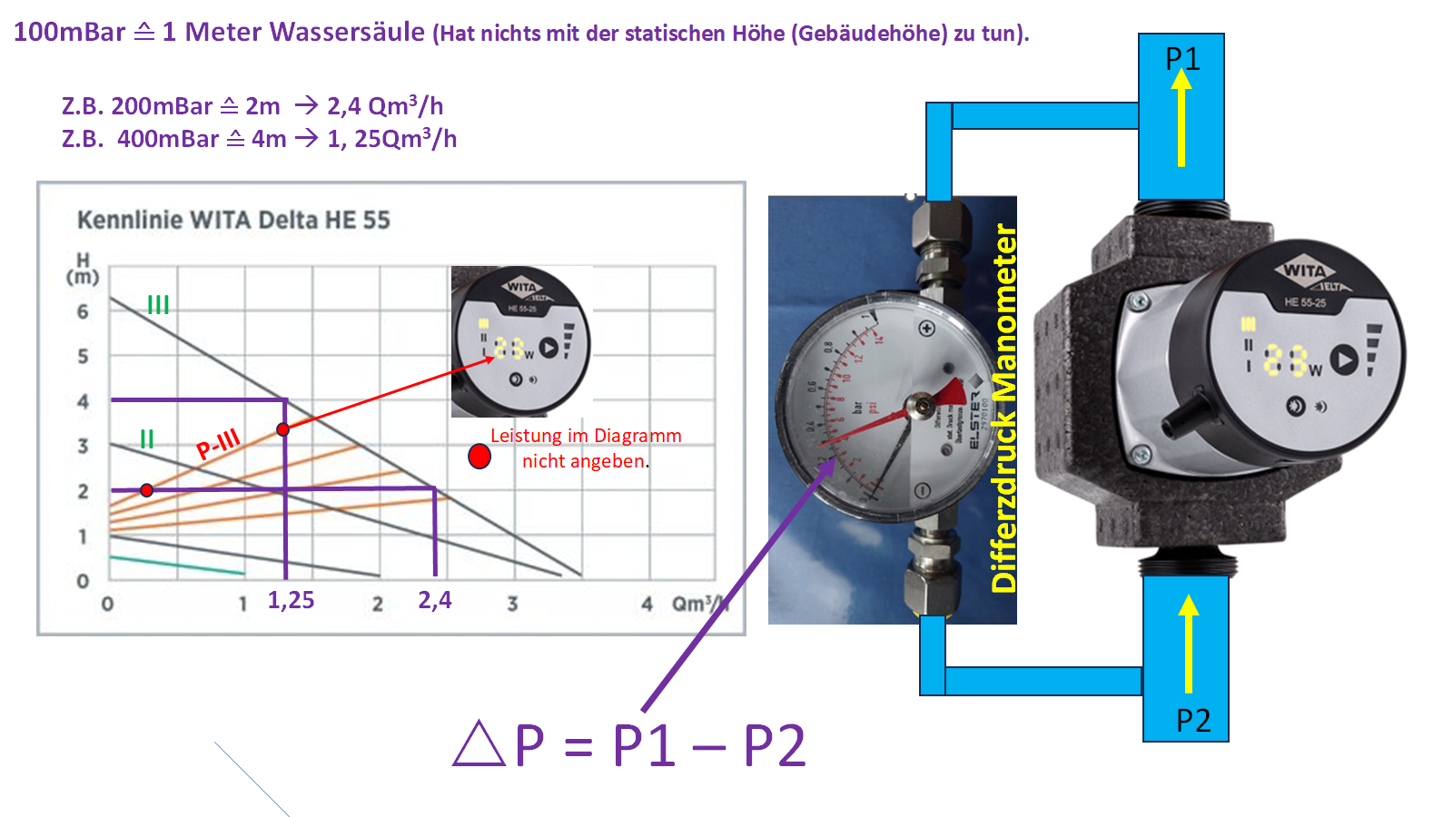 Bei Leistungsstufe P2 und einem Differenzdruck von 200mBar (2 Meter) fördert diese lt. Diagramm ca. 1100 Liter/h. Bei einem Differenzdruck von 100mBar (1 Meter) fördert diese lt. Diagramm ca. 2400 Liter/h. Zeichnung zeigt die dritte Leistungsstufe.