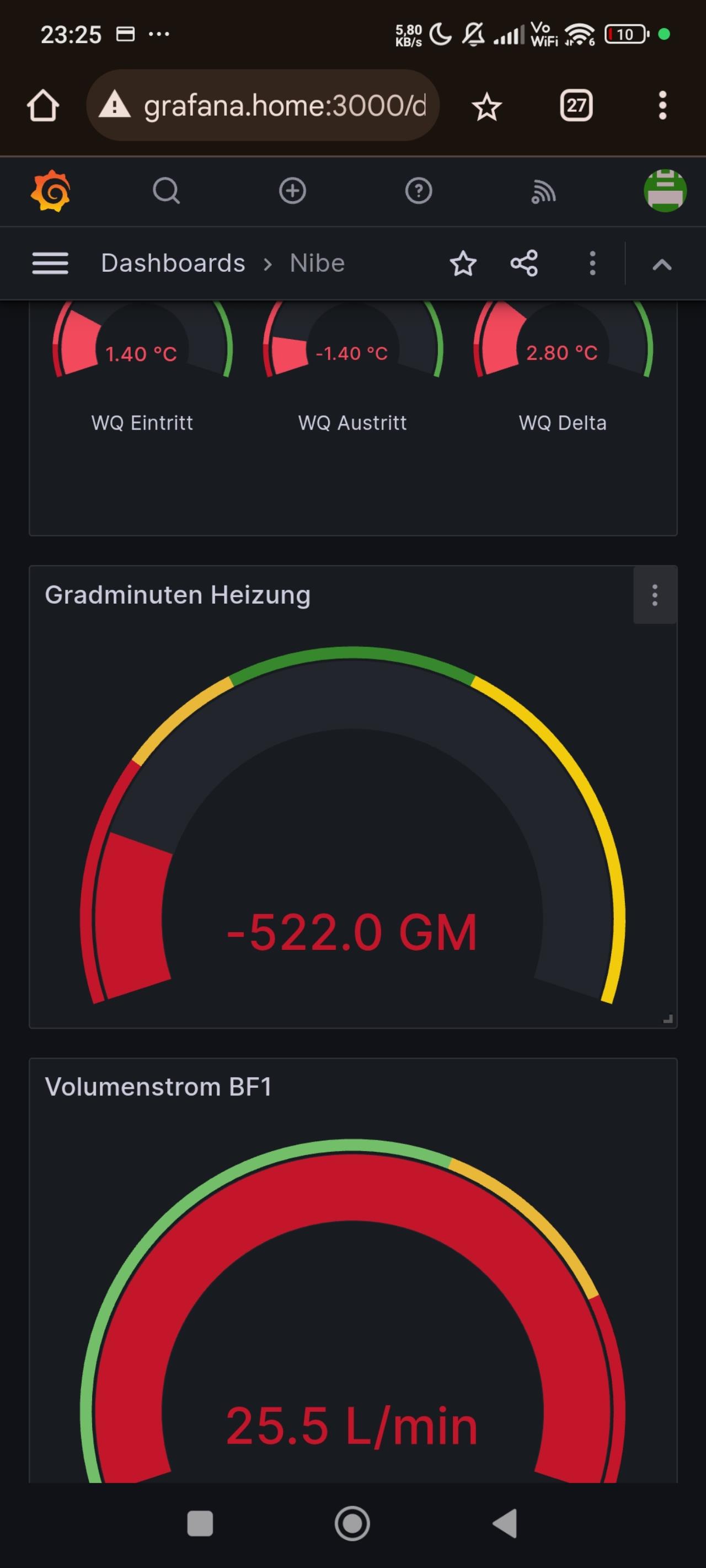 Also das ist mein RGK RGK [Ringgrabenkollektor]: https://grabenkollektor.waermepumpen-verbrauchsdatenbank.de/trenchplanner.html?id=x44rkWXaJ6qOq61IZ6LE Teilstücke liegen aber real bis zu 4 Meter tief (Hanglage / Aufschüttung). Ich habe tatsächlich hin und wieder auch mal 1,58 kW Abgabe bei 25 Hz gesehen, in 95% der Fälle liegen aber so um die 1,76 kW Abgabe bei 25 Hz an. Haus ist aber noch nicht 100% dicht bzw. auch noch nicht bewohnt und daher nur auf rund 18-19 Grad temperiert, wesshalb die VL VL [Vorlauf] natrülich auch den ganzen Winter ziemlich niedrig war. Stand jetzt: Verdichterfrequenz: 25 Hz Wärmequellenmediumeintritt (BT10): 2,2° Wärmequellenmediemaustritt (BT11): -0,7° Vorlauf (BT2): 21,8° Rücklauf (BT3): 20,9° Volumenmesser (BF1): 26,0 l/m Drehz. HU-Pumpe: 100% Drehz. WQ-Pumpe: 41% Errechnete Leistung bei (BT2-BT3): 1,61 kW Stromaufnahme gesamt (extern gemessen): 317 Watt Stromaufnahme Verdichter (intern): 225 Watt Energieentzug seit IBN Ende Oktober 24 (incl. Estrich) ausheizen: 12,4 MWh |