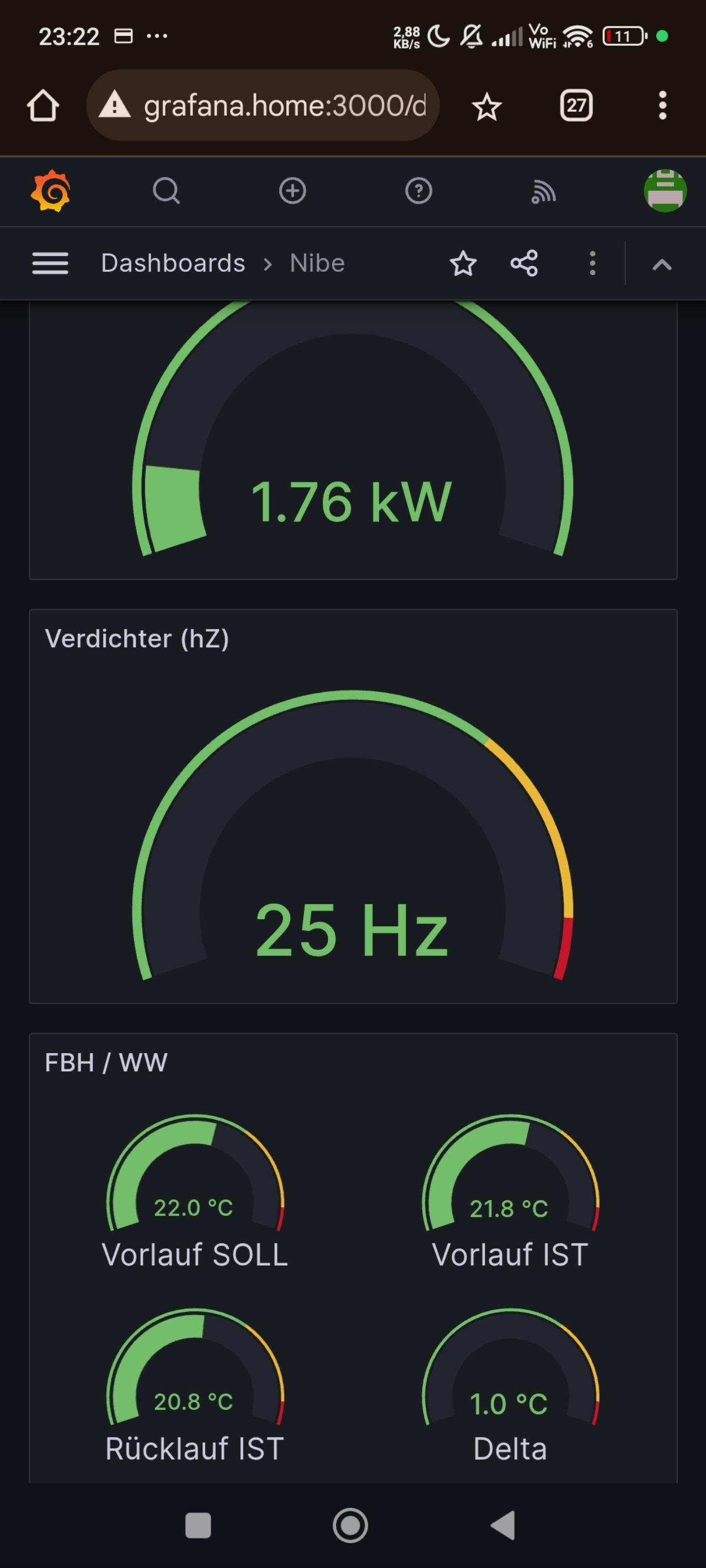 mal zum vergleich die alte F1155/6 bei knapp 10C sole an der unteren grenze. da wurde die heizgrenze nur kurz unterschritten und es hat sich ein takt eingeschlichen. kurz vor ende des 4-stunden-taktes läuft sie knapp unter 1800 W: edit: letzter neustart mit kallibrierung etwa 2 wochen her.