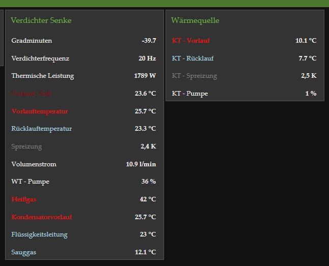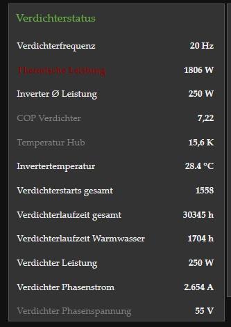 @TheSeeker dein Template finde ich gut, würde ich mal übernehmen und ergänzen:) Verdichterfrequenz: 25 Hz Wärmequellenmediumeintritt (BT10): 1,4° Wärmequellenmediemaustritt (BT11): -1,8° Vorlauf (BT2): 21,8° Rücklauf (BT3): 20,5° Volumenmesser (BF1): 19,2 l/m Drehz. HU-Pumpe: 70% Drehz. WQ-Pumpe: 40% Errechnete Leistung bei (BT2-BT3): 1,71 kW Stromaufnahme gesamt (extern gemessen): 284 Watt Stromaufnahme Verdichter (intern): 223 Watt AZ: 6,02