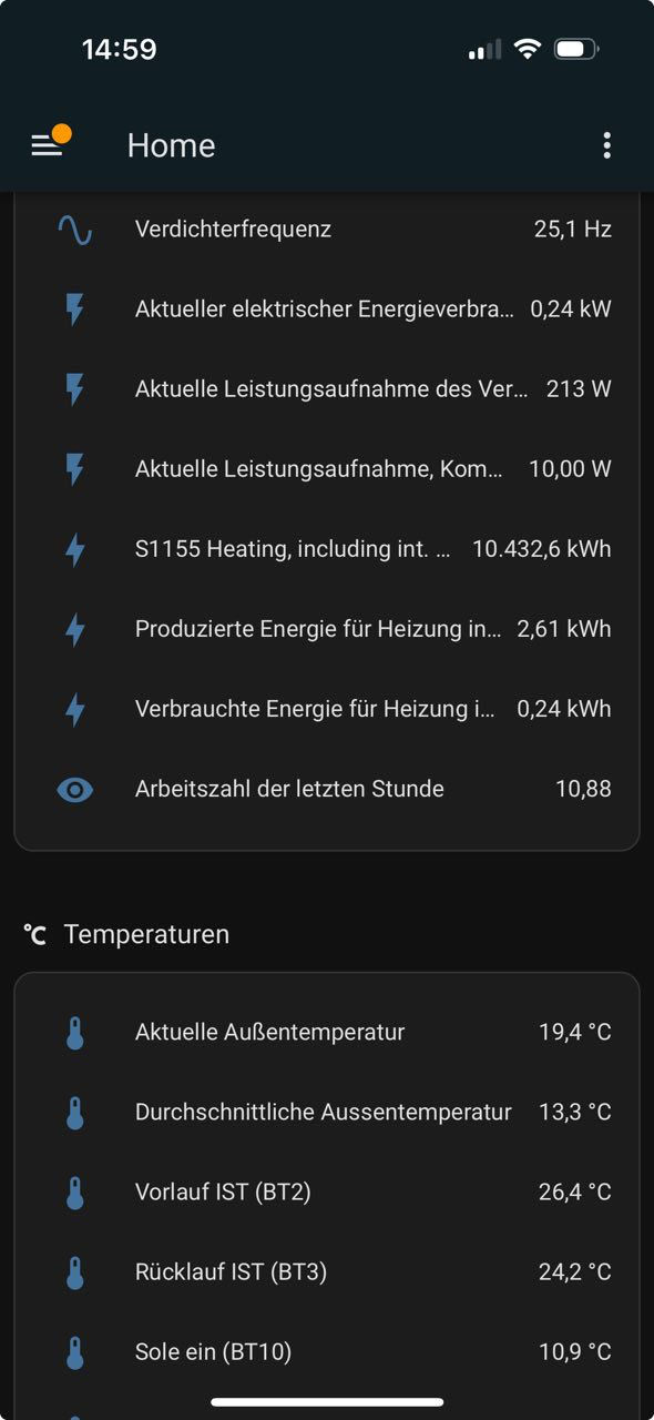 Ich habe lt. EA 9,099 kW Heizlast und mir die 1156-8er geholt, die seit Ende November läuft. Verbaut ist ein Flächenkollektor aus 2008 wo 16 Jahre eine Vaillant geoTHERM VWS 102/2 gelaufen ist. Aktuelle Daten um 15:38 - kurz vorm Abschalten da die GM auf 0 laufen.