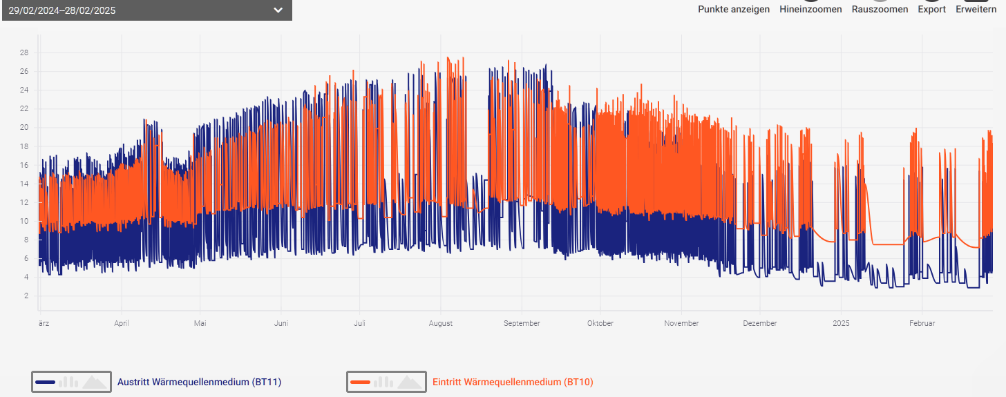 Kann man an den WQ-Tämperaturen ablesen, wieviel Spielraum besteht? Die schauen übers Jahr so aus: Aus 3.1.12 Wärmemengenzähler (BF1): Heizung 8122.2 kWh Brauchwasser 2178.1 kWh WP läuft seit Dez. 2023 Wie beim Beitrag von IWB ("Hatten die Gasheizungen früher die ganze Heizleistung in den Nachbarhäusern erbracht, waren es diesmal nur noch Spitzenlasten und das Warmwasser") wäre es meine Idee, eine Grundlast abzudecken und die Nachbarn machen den Rest mit Gas, Holz,... (Sie denken zwar grundsätzlich über alles nach, aufgrund der reduzierten Förderung ist es der Umstieg wahrscheinlich für sie voerst nicht leistbar). |