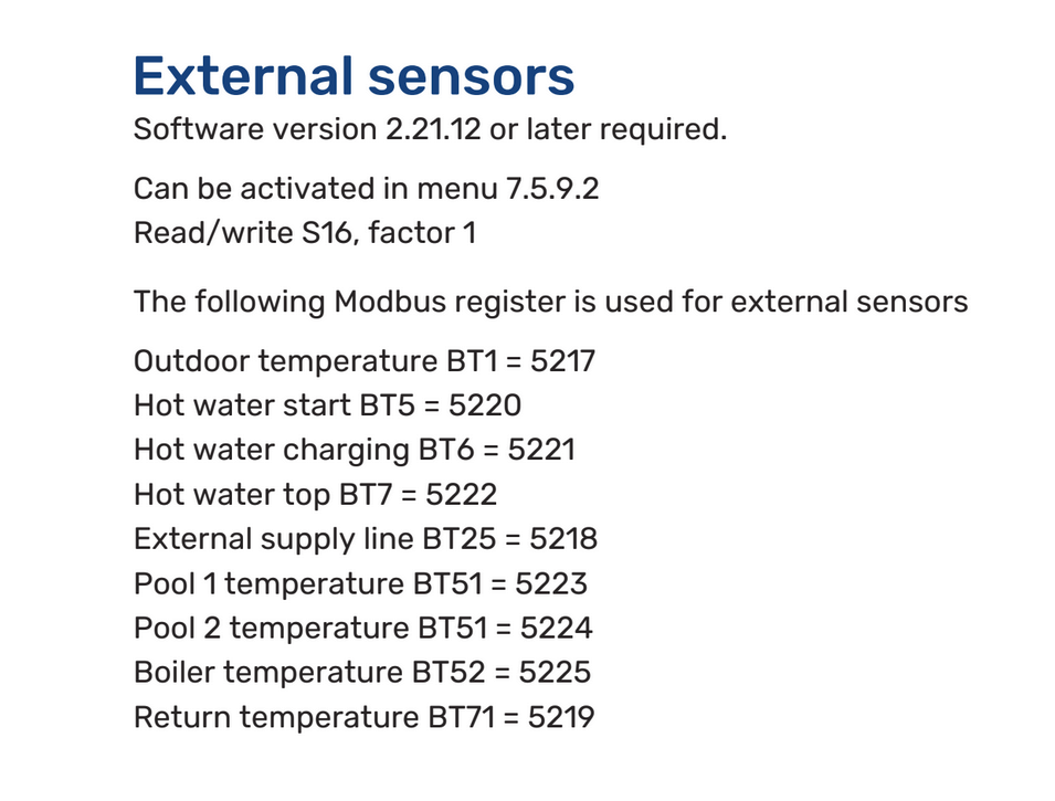 Gibt es irgendwie die Möglichkeit, die Raumtemperatur (BT50 oder so ähnlich) per Modbus zu setzen? Ich hab zwar >40 Temperaturfühler in KNX Geräten im Haus, jedoch keinen expliziten Sensor der WP WP [Wärmepumpe]. |