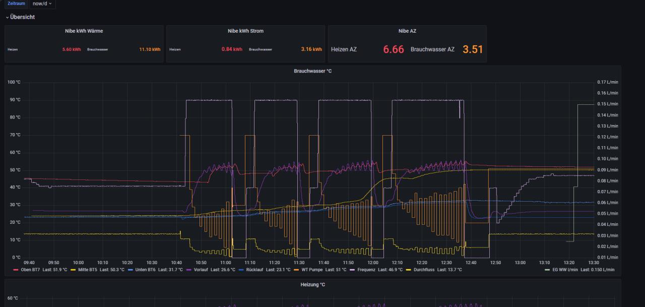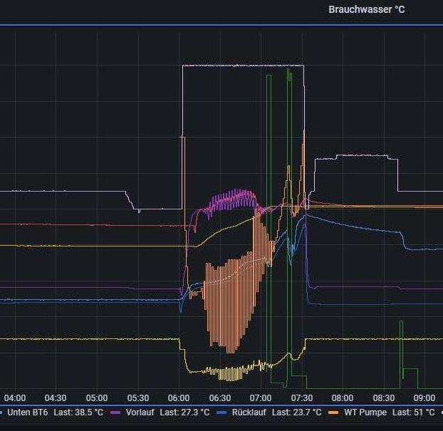Moin Moin zusammen, ich hatte es auch mal gewagt ein Update zu machen. Komischerweise macht die WP WP [Wärmepumpe] S1155 jetzt ab und zu mehrere Takte beim WW WW [Warmwasser] erzeugen. Das war vorher nicht so. Eingestellt ist, wenn BT5 unter 45° fällt dann WW WW [Warmwasser] machen bis BT6 49° unten erreicht hat. Hat jemand zufällig das gleiche Problem oder Verhalten? vorher nachher. Ich kann mir leider nicht erklären, warum er die Takte abbricht. In den ganzen Einstellungen habe ich auch nichts gefunden, was dazu führen könnte. Gruß und Besten Dank. |