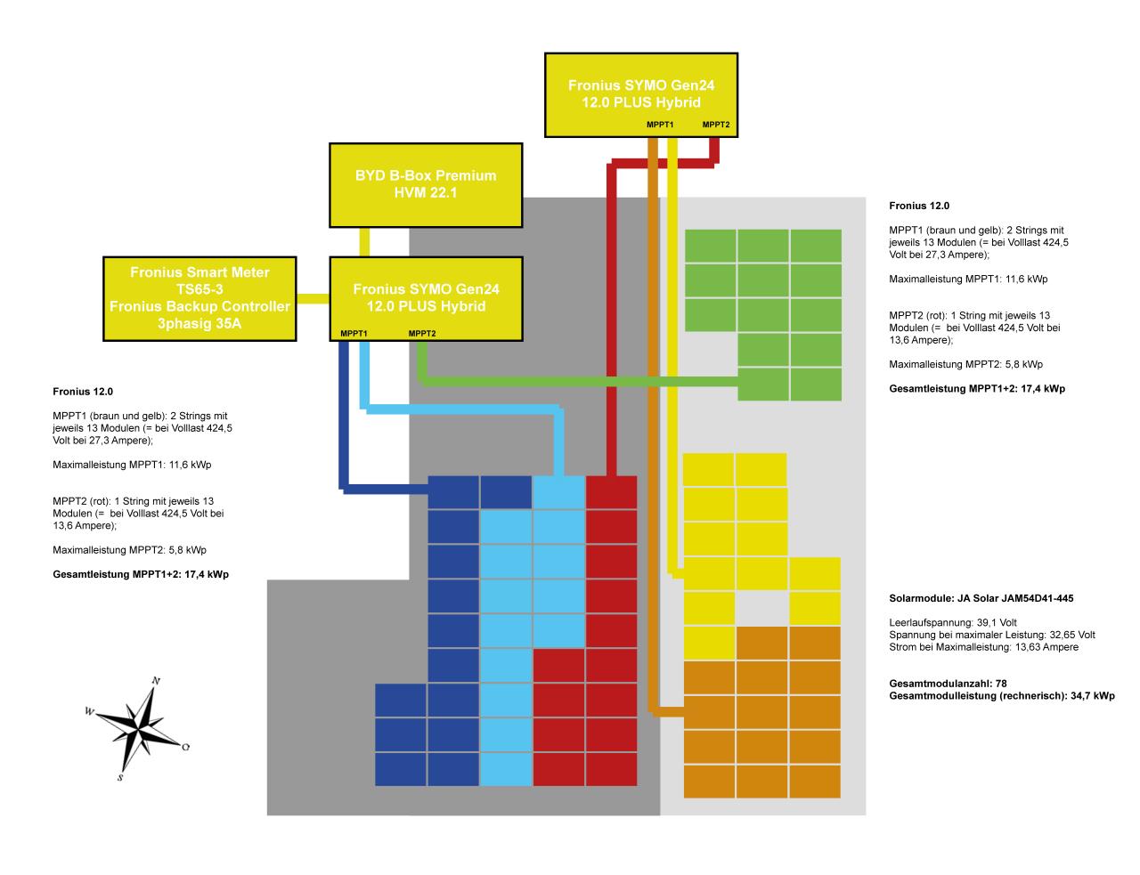 Wenn du Schattenverläufe (Kamin) am Ostdach hast, ist ein Doppelstring (Gelb/Braun) u.U nicht optimal, da es das Schattenmanagement des WR WR [Wechselrichter] beeinträchtigt. Any chance daß du am Ostdach Singlestrings zusammenbekommst ? Der Verto plus hätte den Vorteil, daß die Batterieleistung von 9 kW auf 20 kW steigt. Der kommt aber erst im Sommer. Ist aber auch lauter als die Gen24, falls das ein Thema ist. |