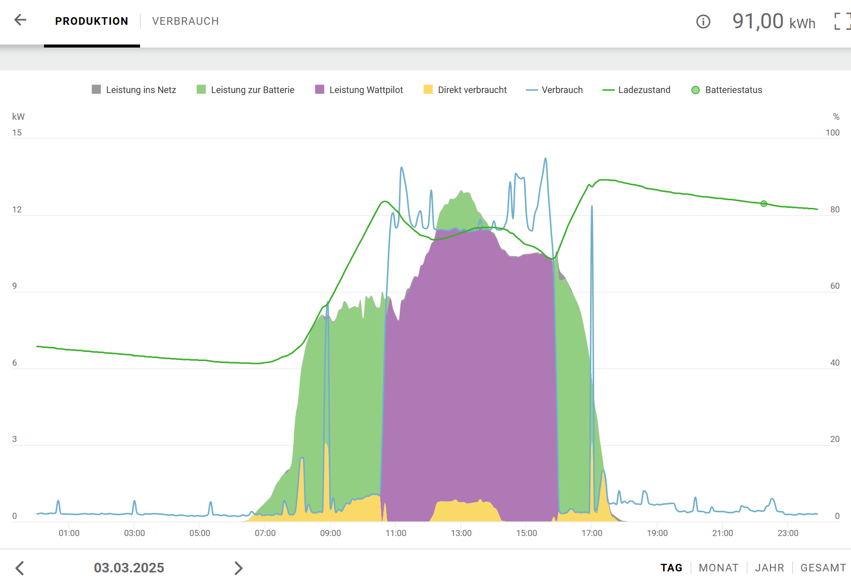 Überschusseinspeisung geht recht gut und einfach. Beispiel: Anfang März. 91 kWh Produktion und eAuto von auf 100% geladen, für die Hausbatterie blieben auch noch 22 kWh über. Ins Netz gingen 0,5 kWh. PS: Die Produktionskurve ist noch suboptimal, da ein großer Baum neben meinem Dach steht, der erst im April einen schönen Kronenschnitt bekommt. Daher fehlen derzeit ca. 30% Ertrag. Sonst wären es 120 kWh gewesen und auch die Hausbatterie wäre voll geworden. Ach ja: Auf meinem 45 Grad Ost/Westdach (gleiche Ausrichtung wie bei dir) sind 3 Schornsteine und 3 Gaupenfenster, die das Fronius Schattenmanagement sehr gut managed. Trotz Baum, Schornsteine und Gaupen kamen gestern bereits 21 kW aus den beiden Gen24 SC 12.0 Wechselrichter. |