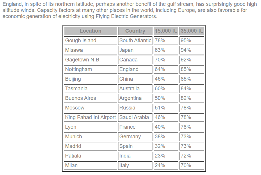 Alternativ ein Skysail, daß auf 500m raufgeht und damit auf ca. 4000 Volllaststunden im Jahr kommt. In Bodennähe erzuegen effiziente Windräder durchschnittlich 200W/qm "Leistung". Durch die kubische Funktion der Windgeschwindigkeit, hätte so ein Höhensegel bei 10.000m Leinenlänge ca. 20 kW/qm |