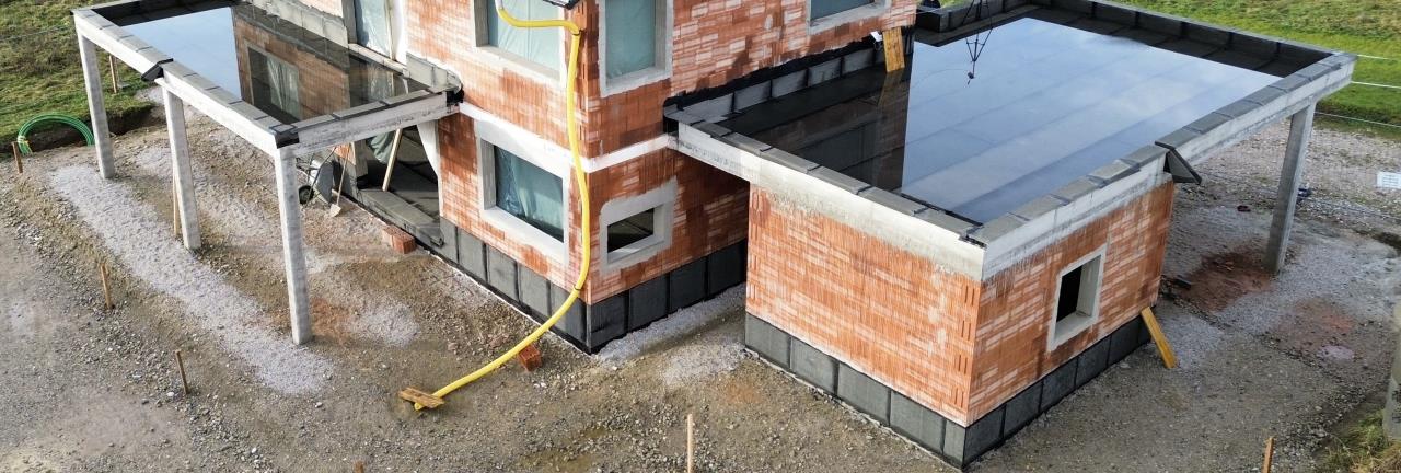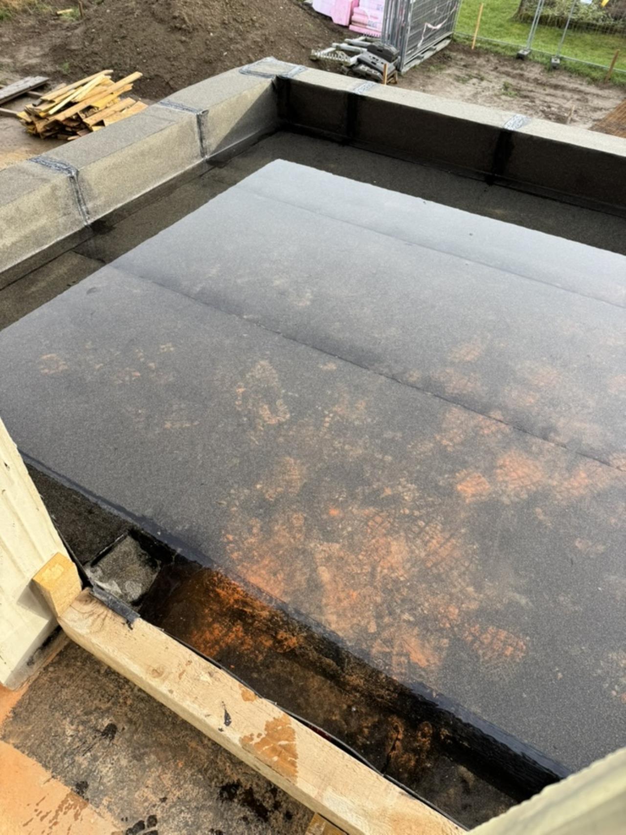 Die Dächer sind ja noch nicht fertig. Aktuell ist dort nur das Bitumen aufgebracht. Das haben sie bei der Attika so rausstehen lassen, damit das anfallende Wasser etwas weiter weg von der Wand runter fließen kann. Das wurde abgestimmt. Damit dort das Wasser nicht hineinrinnt, haben wir als das Dach fertig war, ein Kantholz hingelegt und das Bitumen rangeflämmt. Mittlerweile sitzt dort auch schon die Balkontür (auf Purenit). Jetzt in den nächsten Wochen werden die beiden Dächer fertiggestellt, dann wird der Hochzug noch einmal weggeschnitten und die Balkontüre eingebunden. Zuerst den Hochzug mit Bitumen ran und dann noch mit Triflex abgedichtet wenn ich das richtig verstanden habe. |