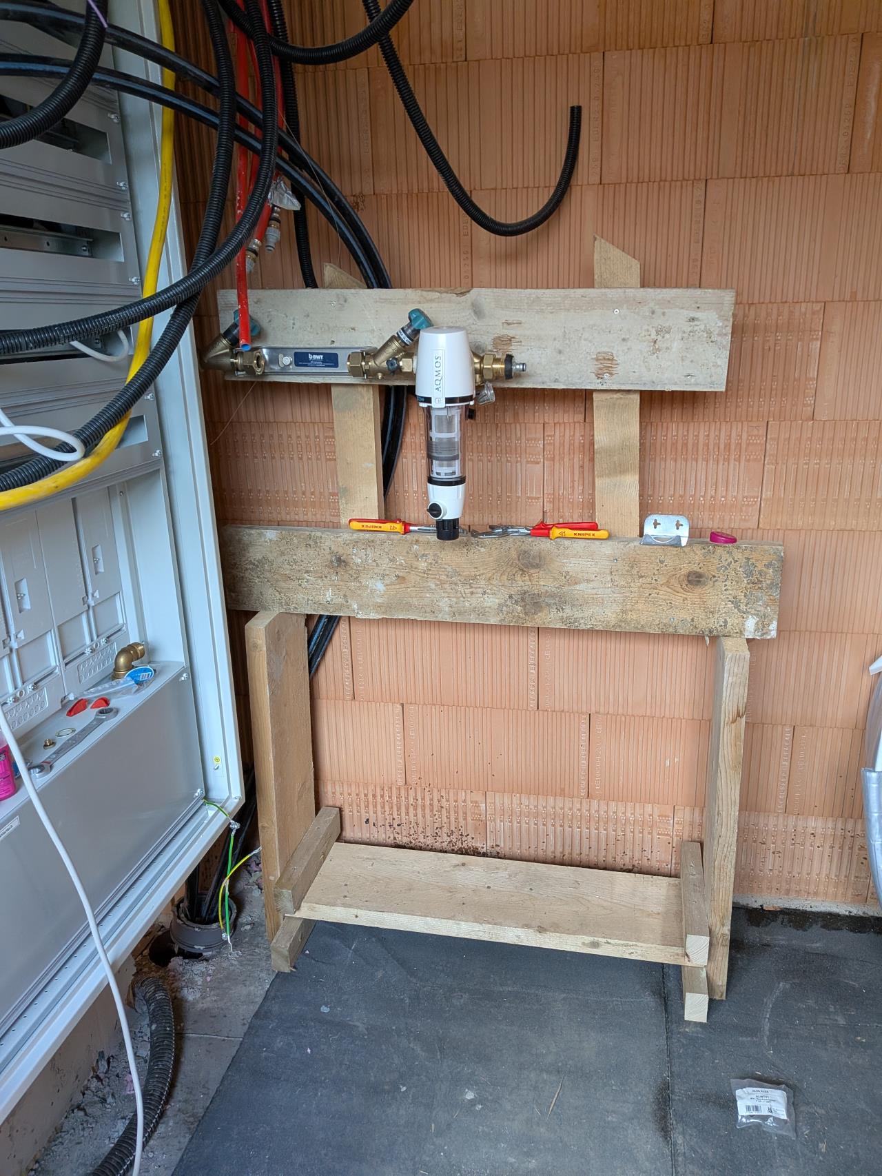 Wird weiter auf der Wand nach rechts wandern, wenn verputzt ist, aber ich meine es gibt keine Regel, dass Verteiler und Wasser nicht nebeneinander sein dürften, wird ja eh an die Erdung angeschlossen... |