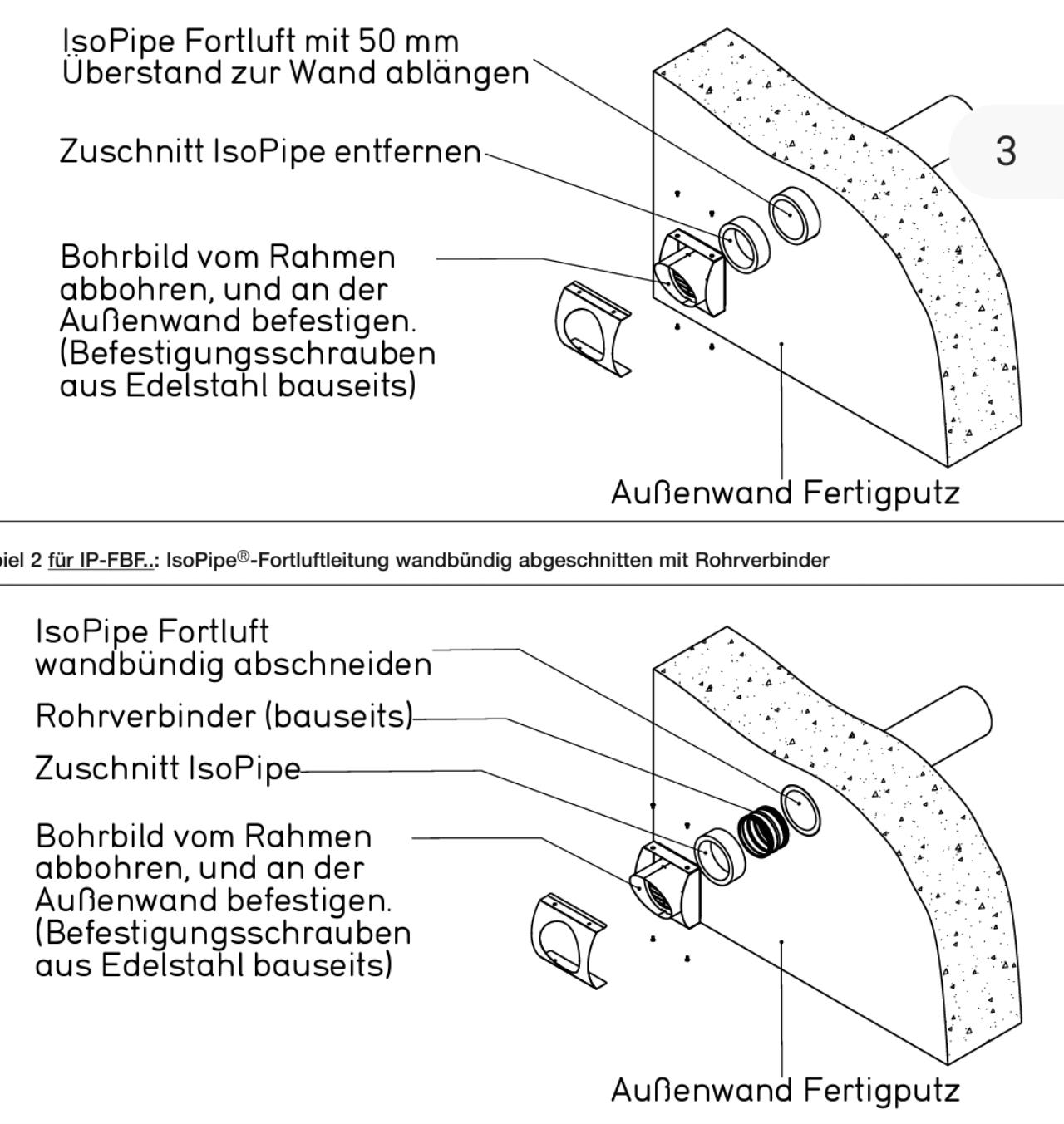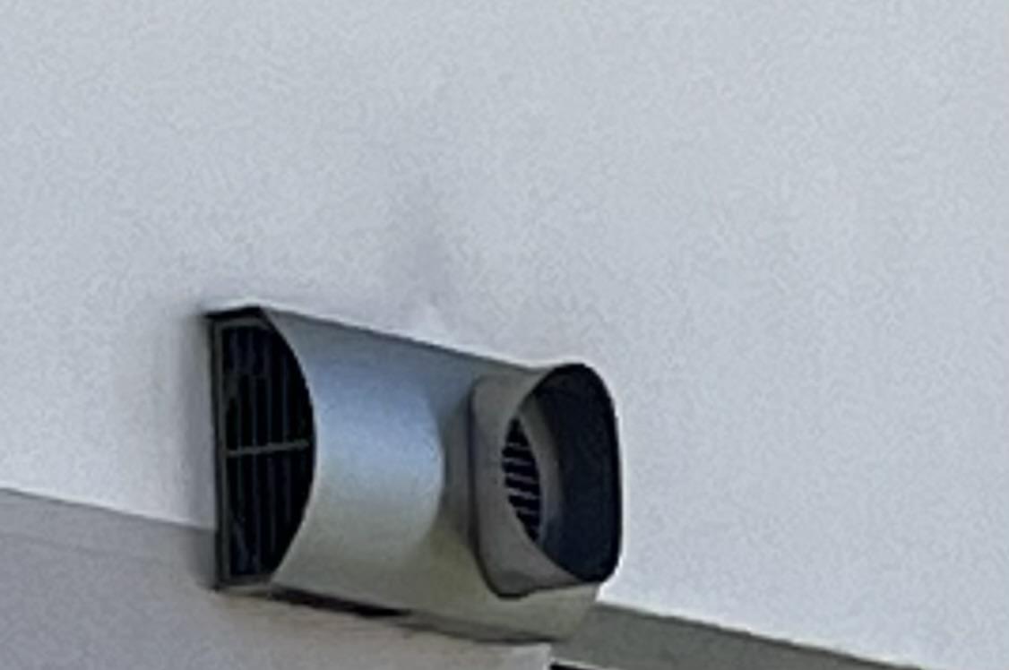 Genau über dem Auslass. Ich hab auch die Vermutung, dass da eine Art Verbindungsstück fehlt. Die Rohre von innen sind bündig abgeschnitten mit dem WDVS WDVS [Wärmedämmverbundsystem], ich meine da gehört dann so ein Verbinder für 160er rein. Leider für mich nicht erreichbar zum Nachschauen. Ich weiß es aber leider nicht genau, vielleicht ist das Stück von der Kombiblende auch so lang, dass es in das Fortlugtrohr gesteckt wird. Oder es fehlt eine Dichtung. Man findet nicht viel zu dem Bauteil im Netz.
