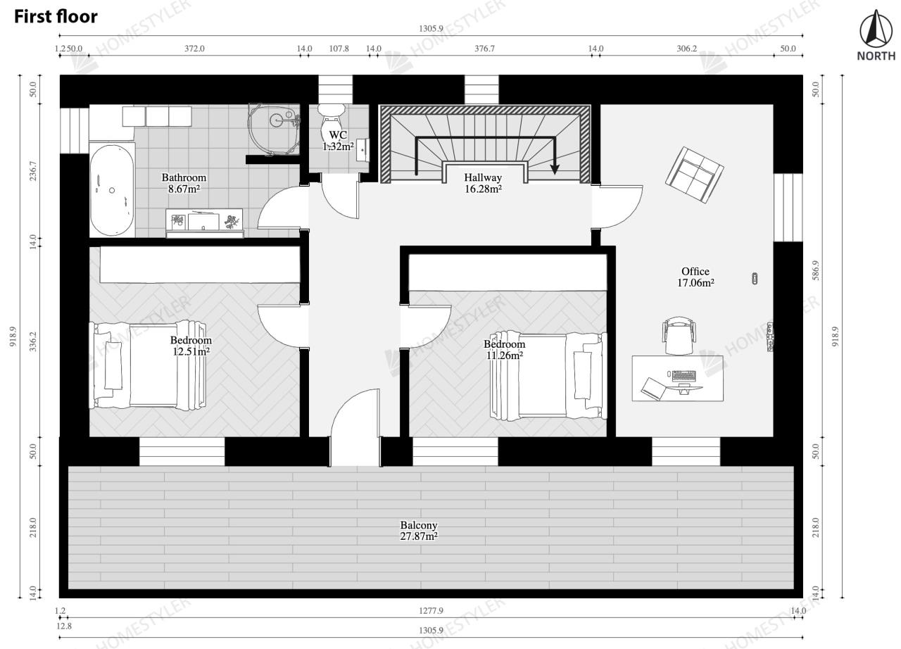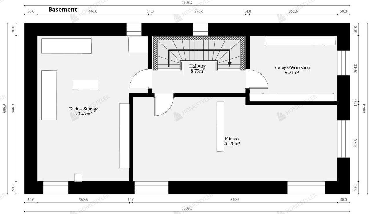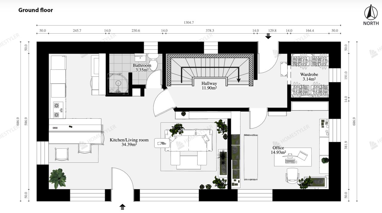 Ich weiß nicht, wie das Stiegenauge (dort wo "Hallway" steht) genutzt werden soll, aber das wäre der ideale Ort für Steigleitungen der Lüftung, für die Heizungsleitungen, sowie FBH FBH [Fußbodenheizung]-Verteiler und die Elektroleitungen.