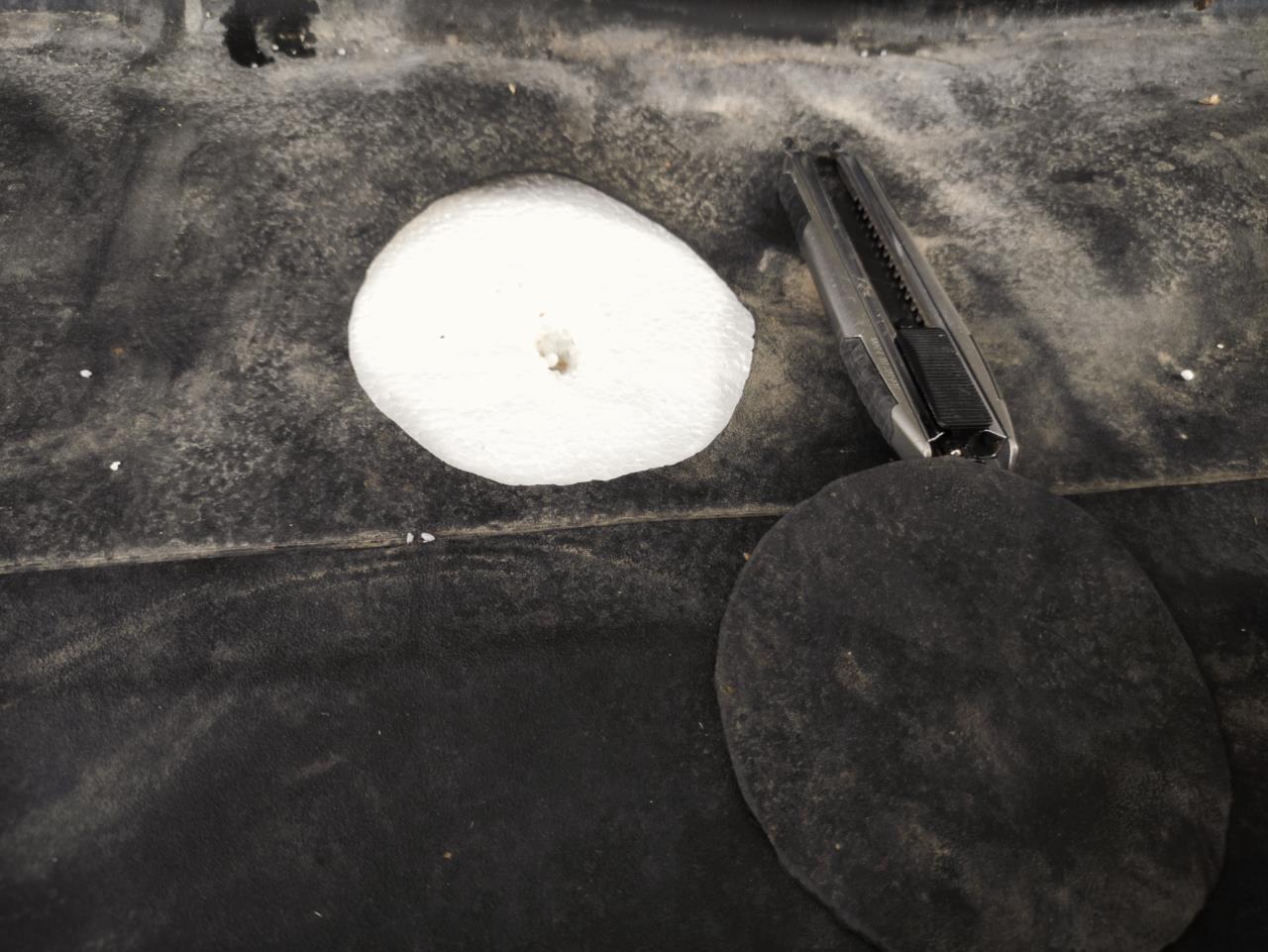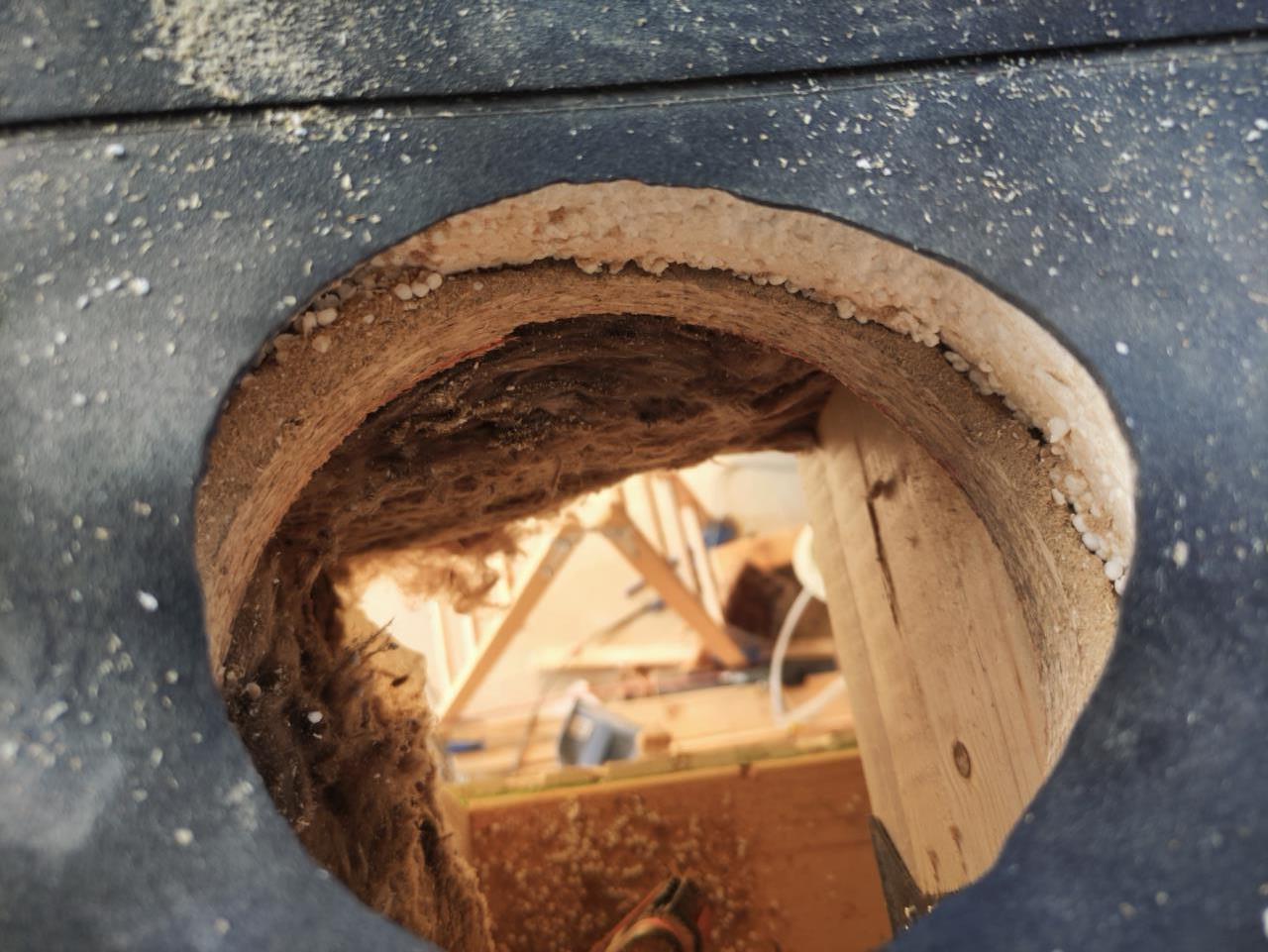 Falls jemand irgendwann mal vor dem gleichen Problem steht, ich mach das jetzt selber. Der erste Schritt, also Rohre durch Folie, ist gemacht. Ich hab von unten mit einem 10er Bohrer durchs Holz gebohrt, dann mit einer Gewindestange durchs Styropor bis zur Folie gestochen. Dann ein 110er KG-Rohr als Schablone oben aufgesetzt, angezeichnet und ausgeschnitten.