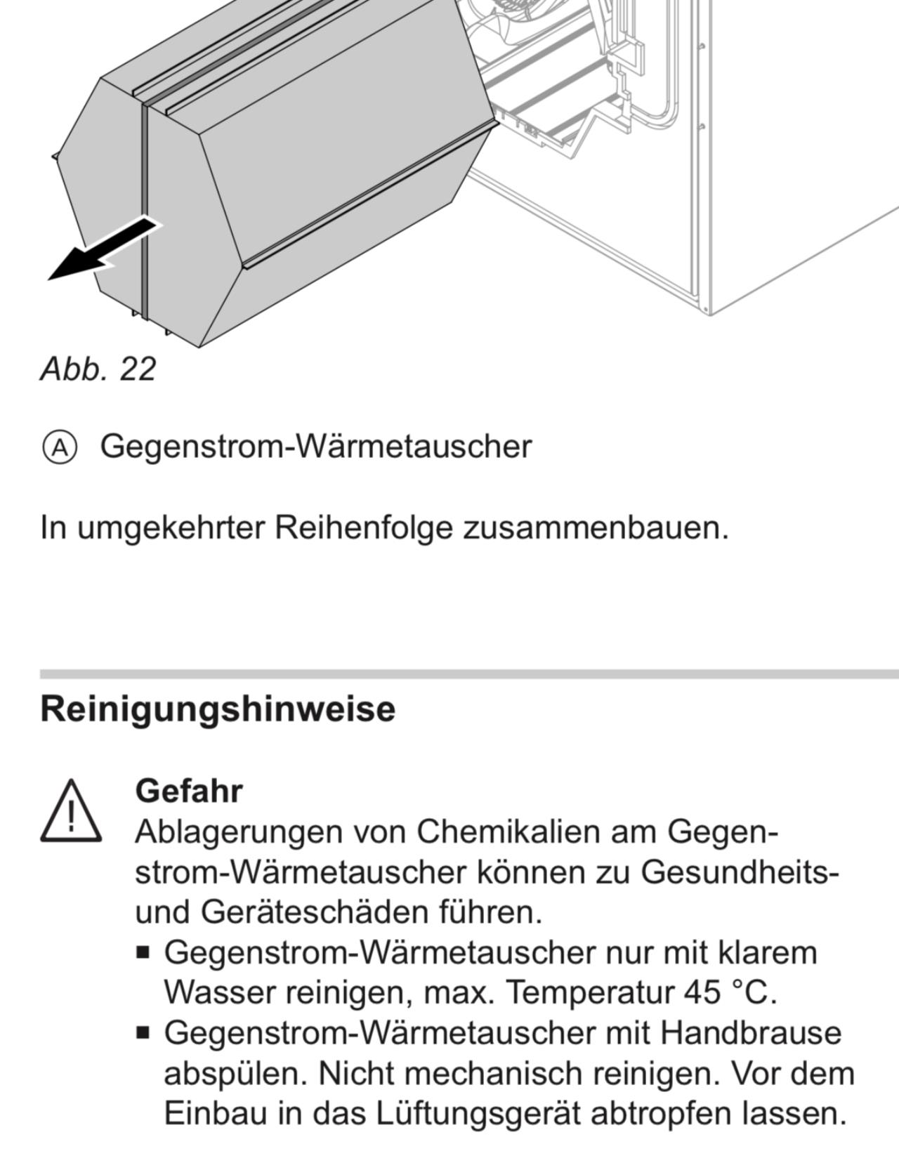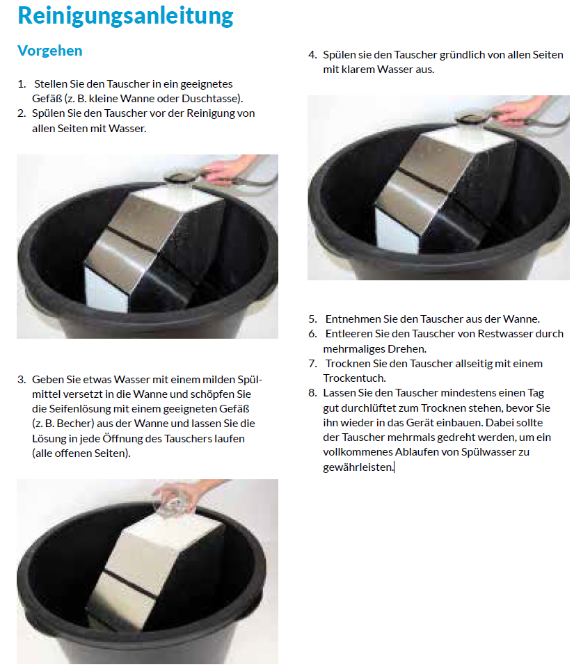 Es geht hier wieder einmal um die Verhältnismäßigkeit. Der Wärmetauscher muss nicht sauberer sein, als irgendeine Oberfläche in der Wohnung. Kalkfreies Wasser halte ich jetzt für übertrieben. Ich würde auch vor ein paar Tropfen mildem Spülmittel nicht zurückschrecken, das man in einem Kübel mit lauwarmem Wasser auflöst. Natürlich sollte es kein stark alkalischer oder stark saurer Reiniger sein. Gut nachspülen mit Handbrause! Abtropfen lassen (15 Minuten) und wieder in der richtigen Lage einbauen. Wenn es draußen extrem feucht ist oder unter +5°C sollte man die Tauscherreinigung nicht gerade machen. Die Oberflächen werden relativ rasch wieder bei Lüftungsbetrieb trocknen. Angst vor Schimmel muss man nicht haben, sonst wäre Wäsche aufhängen zum Trocknen auch problematisch. Wenn man einen Kondensatablauf nutzt, diesen auch gleich auf Durchfluss überprüfen.