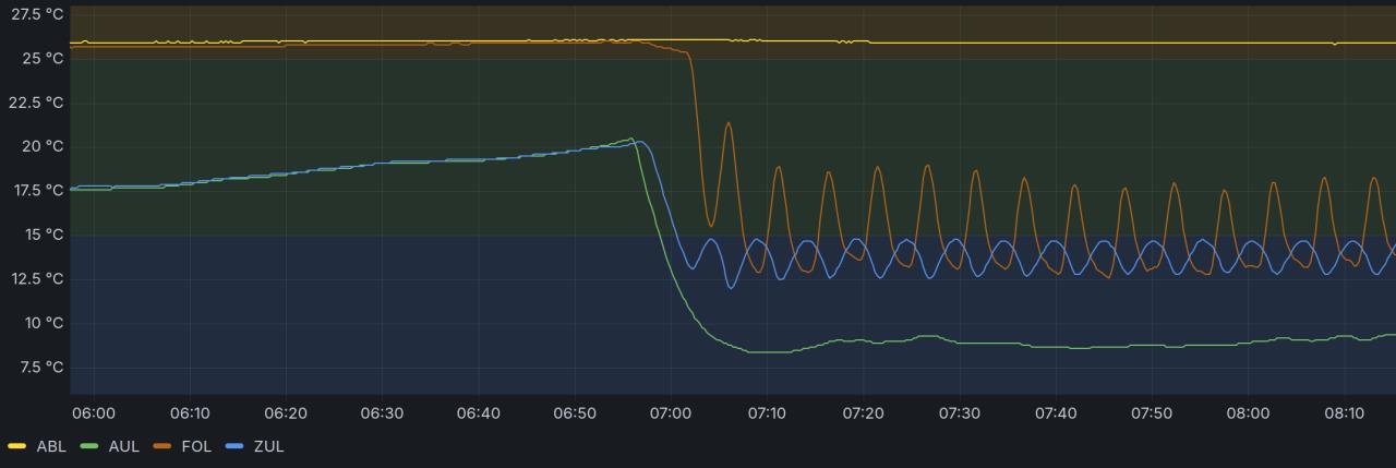 Um das Thema abzuschließen und zukünftigen Gästen eine Idee an die Hand zu geben, hier ist meine vorläufige Lösung (zusätzlich zur Beschattung): Das Monoblock-Klimagerät bläst direkt ins Ansaugrohr der KWL KWL [Kontrollierte Wohnraumlüftung]. Effizienzpreis gibts dafür keinen, aber immer noch besser, als das Gerät innen aufzustellen. Die Außenluft kommt um ungefähr 12K abgekühlt bei der KWL KWL [Kontrollierte Wohnraumlüftung] an. Der Bypass moduliert und hält die Zuluft ein gutes Stück über dem Taupunkt. Nachdem die Luft im Haus eh schon relativ trocken ist (37% bei 26°C), habe ich aber auch am noch ungedämmten Außenluftrohr kein Kondensat. Dass durch die WRG auch die Fortluft ein bisschen gekühlt wird, ist in dem Fall sogar ein Bonus. Die geht aktuell nämlich in die auch viel zu heiße Garage. Großartig kühlen kann man so natürlich nicht, aber einen leichten Abfall der Innentemperatur kann man schon messen. Also ich bin zufrieden. |