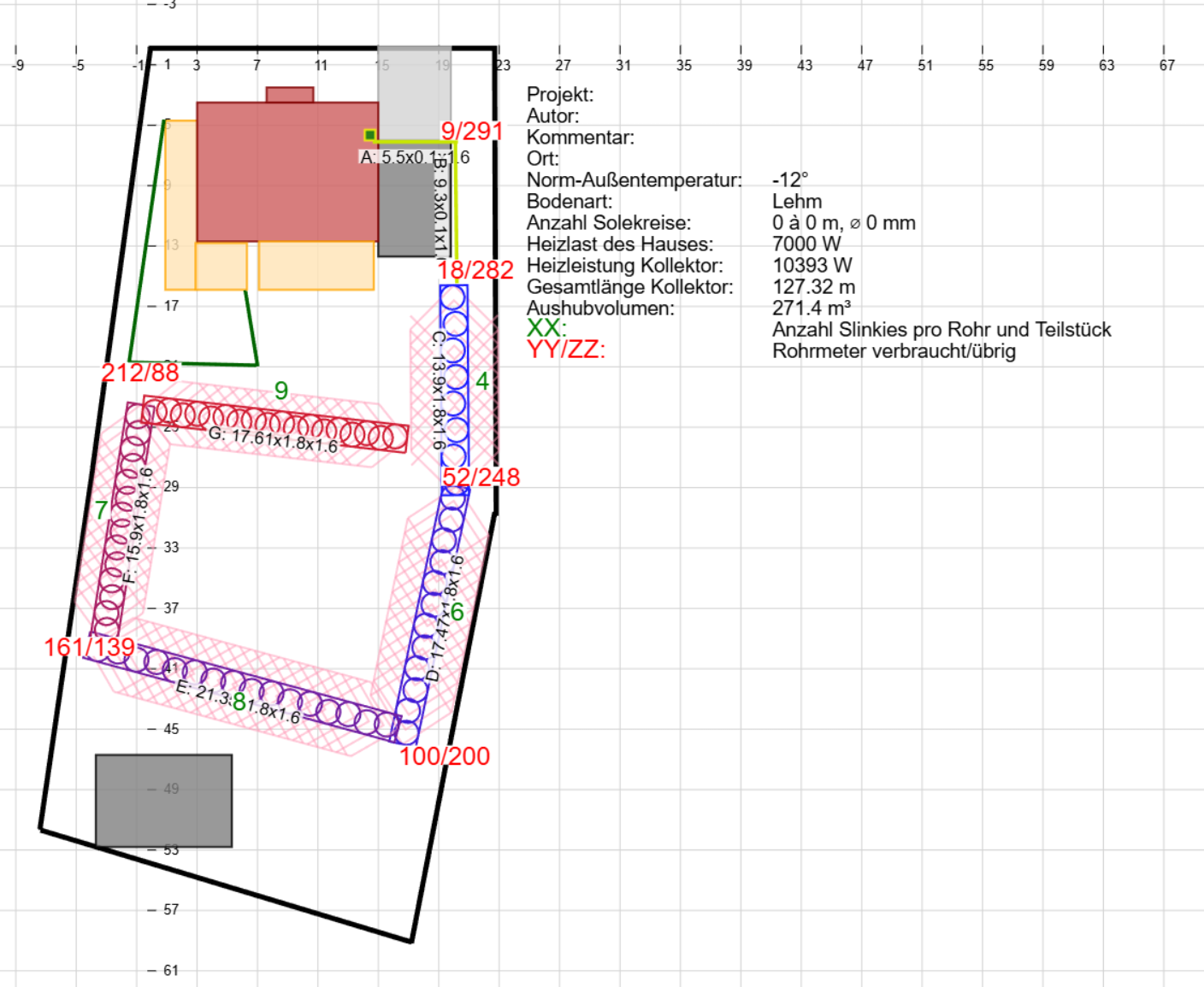 positiv für die Planung, das Grundstück ist völlig ausreichend für eine RGK RGK [Ringgrabenkollektor] Erschließung. Würde persönlich etwas anders planen, neben der Garage bereits die gerade Verlegung als Wärmeentzug nutzen.