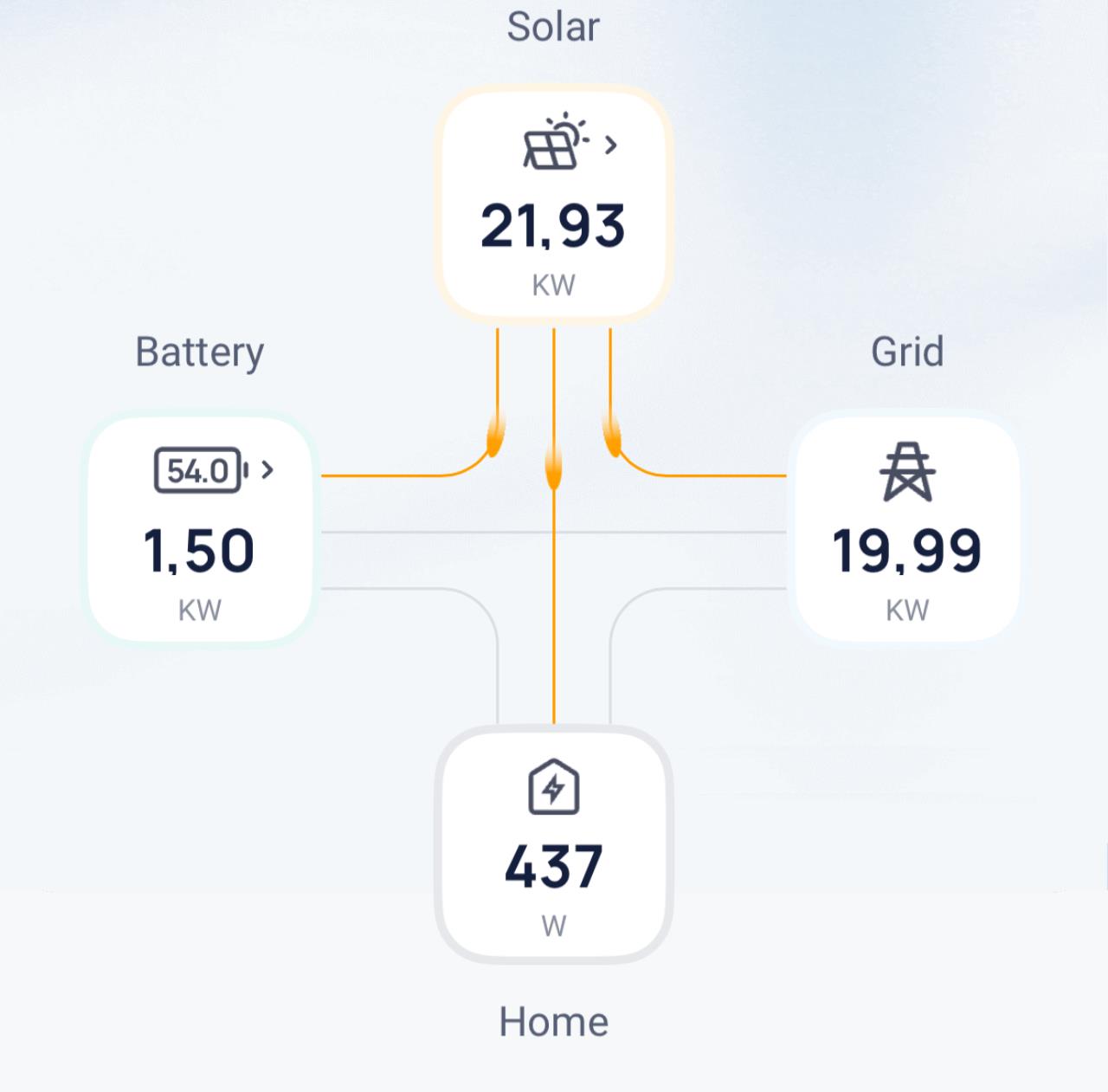 In der App stellt sich das so dar, dass vom Punkt "Solar" in Richtung "Home" z.B. 500 Watt fliesen. Wenn es dunkel ist, ist der Hausverbrauch auch wie zu erwarten bei 0. Laut Smartmeter vom Netzbetreiber wird auch nichts aus dem Netz verbraucht. Am Chint Meter sehe ich jedoch, dass mir z.B. von 6 kW Produktion (vom