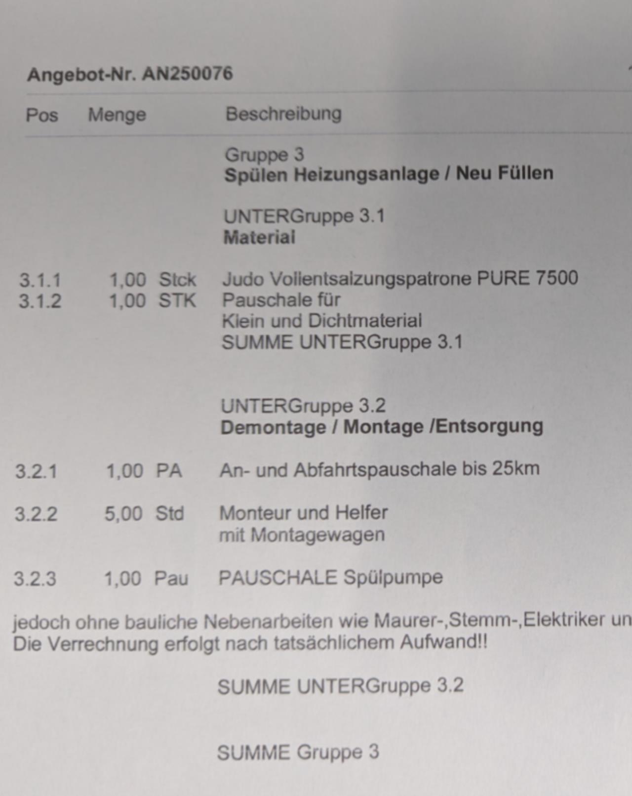 Okay. Ist schon fair. Dauert wenn gescheit gemacht wird, also auch luftfrei Spülen der einzelnen Kreise einen Tag. Wasser der Liter auch ca 1,50 Euro.