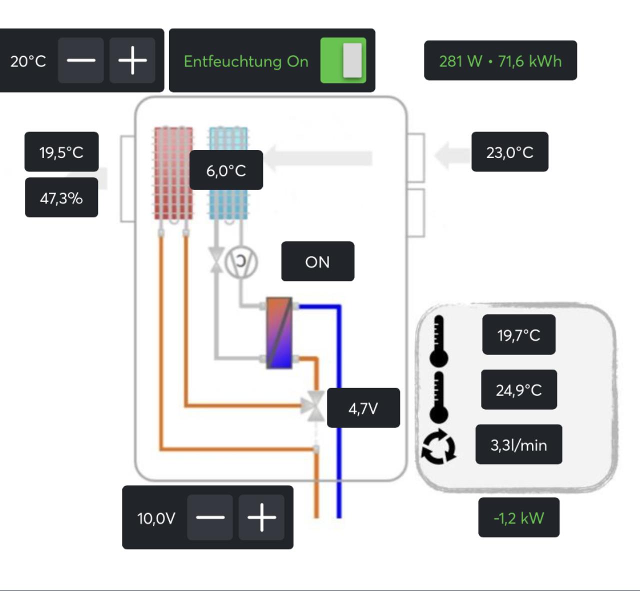 Die Regelung der Auslasstemperatur erfolgt mit einer Logik in Loxone - alle 30sec. wird die Spannung am Regelventil im HRDS Modul um 0,1V erhöht oder verringert bis die Zieltemperatur +/-1°C erreicht ist. Funktioniert überraschend gut.