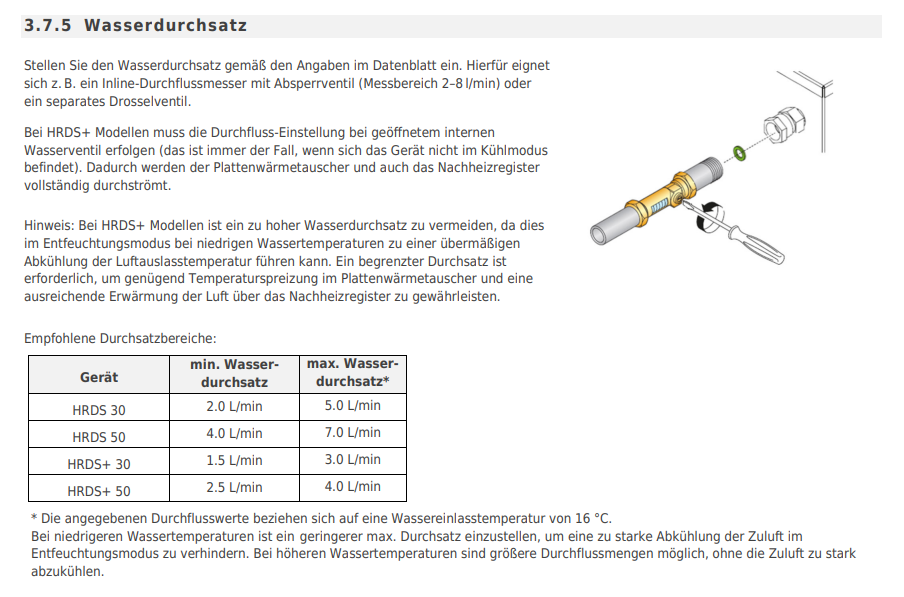 Für den Entfeuchte-Modus sollte der Durchsatz aber auch nicht zu hoch werden: Falls das Wasser sehr kühl ist und bei hohem Durchsatz kann es sonst sein, dass die Luftauslasstemperatur vielleicht tiefer liegt als erwünscht.