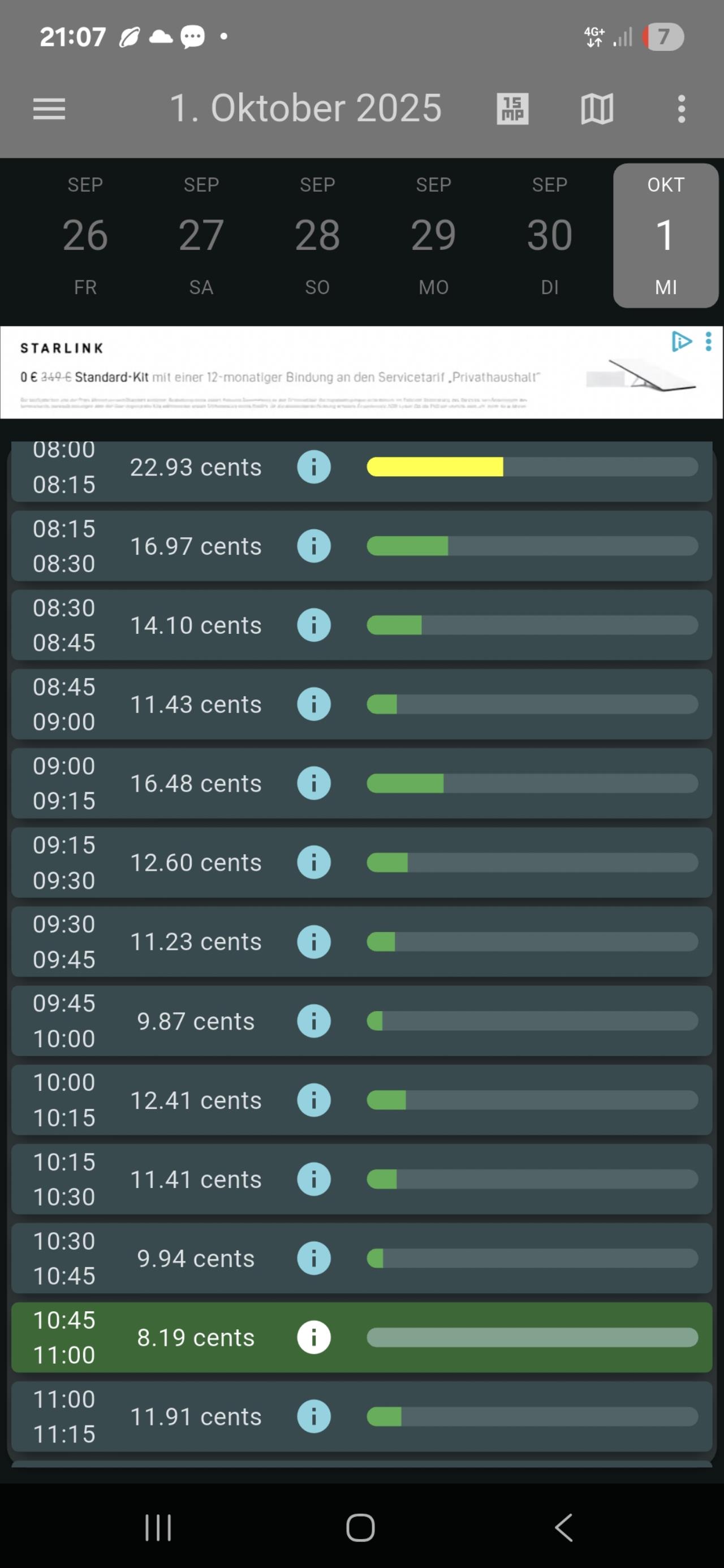 ab morgen gibts 15 minütige intervalle!!!? die umstellung war ja geplant, wurde dann aber verschoben! in der spotpreisapp sieht mans schon nur der loxone baustein wird dann wohl nicht mehr funktionieren wirds auch verrechnungstechnisch ab morgen schon umgesetzt!? mails gabs ja keines diesbezüglich zb von smart energy & co hab korrekte preise ab morgen heute sind die preise auf 0 sogar die letzten 2 tage sehe ich nun 15 minütig genau seit 3 stunden zach das der spot preis optimierer dann nicht mehr funktioniert zb lade innerhalb der nächsten 13 stunden $ stunden muss dann alles adaptiert werden 96 statt 24 preiszonen entweder stoppt er dann mal 15 minuten durch die preissprünge oder man nimmt einen durchschnittspreis die preise hüpfen nämlich doch erheblich innerhalb einer stunde wäre zb der 3te 15 minuten abschnitt zu teuer weil in stunde 7 nochmal ein sehr günstiger abschnitt dabei ist kommt.es öfyer zu 15 minuten pausen oder auch sehr oft |