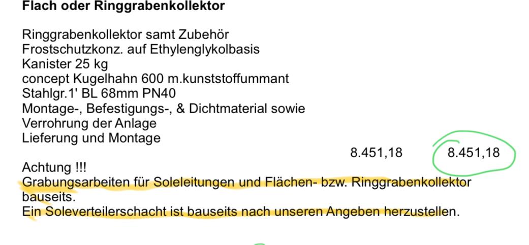 Da würde ich den Installateur folgendes Angebot machen: Du kaufst über den RGK RGK [Ringgrabenkollektor] Shop das RGK RGK [Ringgrabenkollektor] Paket inkl. Sole um 1600€ netto und legst den RGK RGK [Ringgrabenkollektor] selber ein. Die professionelle Planung läuft sowieso über ein Planungsbüro und nicht über den Insti. Soll unter 1000€ kosten.