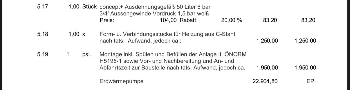 Die Stiebel in deinem Angebot kann bis 1kW runter. In dem Angebot ist übrigens auch die Soleflüssigkeit für den RGK RGK [Ringgrabenkollektor] (?) auch schon drin. Die Fernbedienung um 500€ benötigt man wohl nicht. Warum ist da extra eine Pumpengruppe samt Mischer drin (5.14)?? Komplett für'n Hugo im Neubau, sag ich mal...