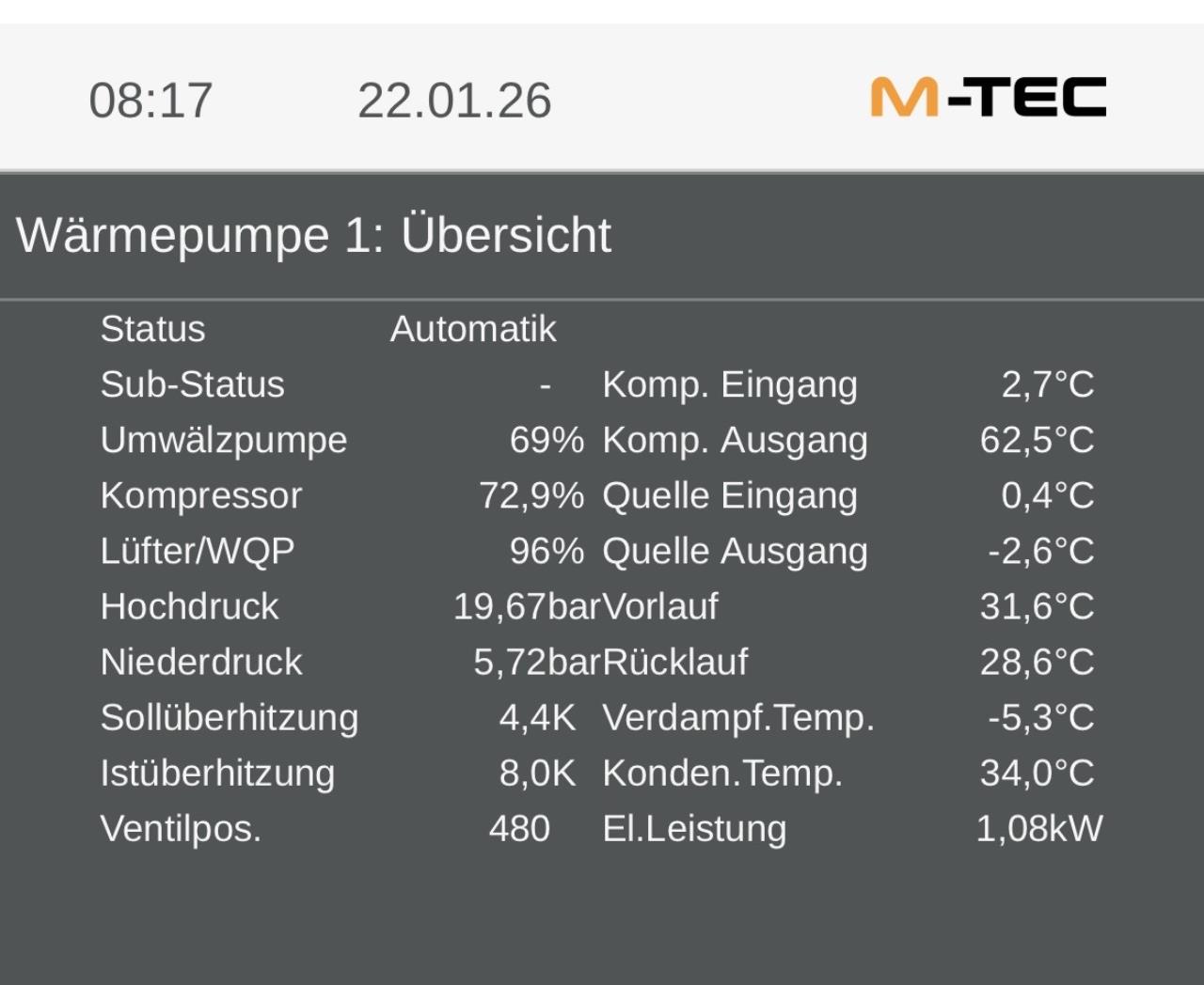 Durch die kalten Temperaturen bewege ich mich schon länger am Limit. Außenlufttemperatur (BT1): -6.9 °C Mittlere Außenlufttemperatur: -5.5 °C Leistungsbedarf bei NAT: 5 kW Aktuelle Verdichterfrequenz: 90 Hz Vorlauf (BT12): 31.9 °C Rücklauftemperatur (BT3): 25.1 °C Drehz. HU-Pumpe (GP1): 43 % Wärmequellenmediumeintritt (BT10): -2.0 °C Wärmequellenmediumaustritt (BT11): -5.2 °C |