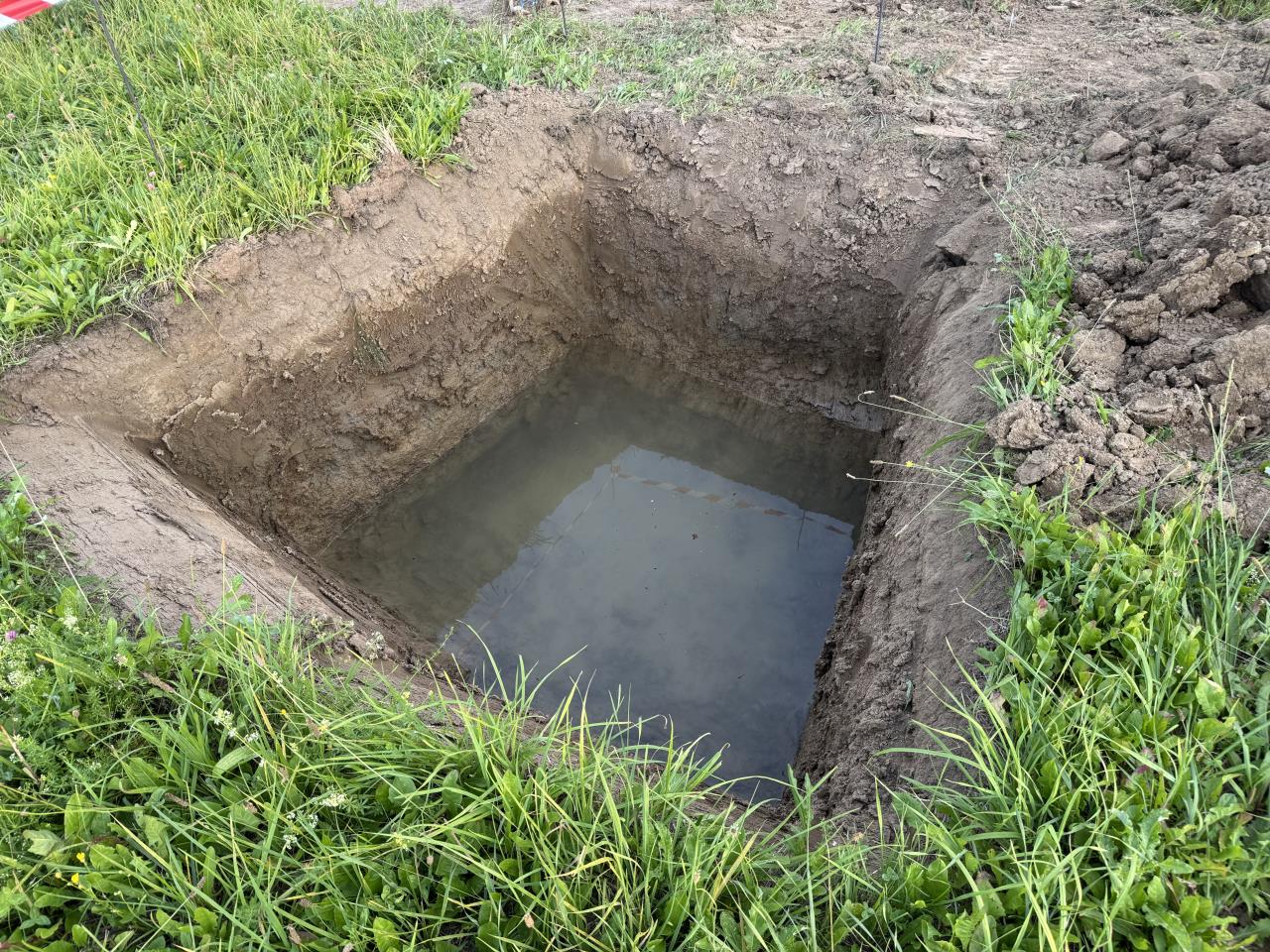 Danke für euer Feedback! Also, der Hang ist nicht steil (ca. 7-9%), aber in der Tat sehr feucht/nass. Im unteren Teil haben wir Hangwasser bei 0,9m unter GOK stehen, weiter oben, wo das Haus hinkommt bei ca. 3m - 2m unter GOK. Den RGK RGK [Ringgrabenkollektor] können wir in jedem Fall ins Hangwasser setzen. Eingraben dürfte bei Abpumpen/Entwässerung dem Gefälle entlang eigentlich kein Thema sein. Die Gruben/Künetten auf den Nachbagründen haben trotz Nässe alle gehalten. Ob das Jahrzehnte so bleibt, weiß ich nicht, aber wir würden dann zumindest mal regulär mit einer ausreichenden Länge/Leistung planen und uns dann über bessere Soletemperaturen freuen. Damit ihr mal eine Vorstellung habt, wie es hier ausschaut: Grube für einen Kanalanschluss, bei uns wird das Wasser allerdings nicht überall so hoch stehen, eher am unteren Ende: ![]() Künette für Wasser/Strom/Internet an der unteren Grundstücksgrenze (wir bauen zum Glück oben): ![]() Dann hat das Wasser ja doch noch was Gutes :-D @Lu1994 wie war das bei euch - habt ihr einfach eine Saugpumpe reingestellt? Und bei euch ists dauerhaftes Grundwasser wegen dem Bach, oder? |