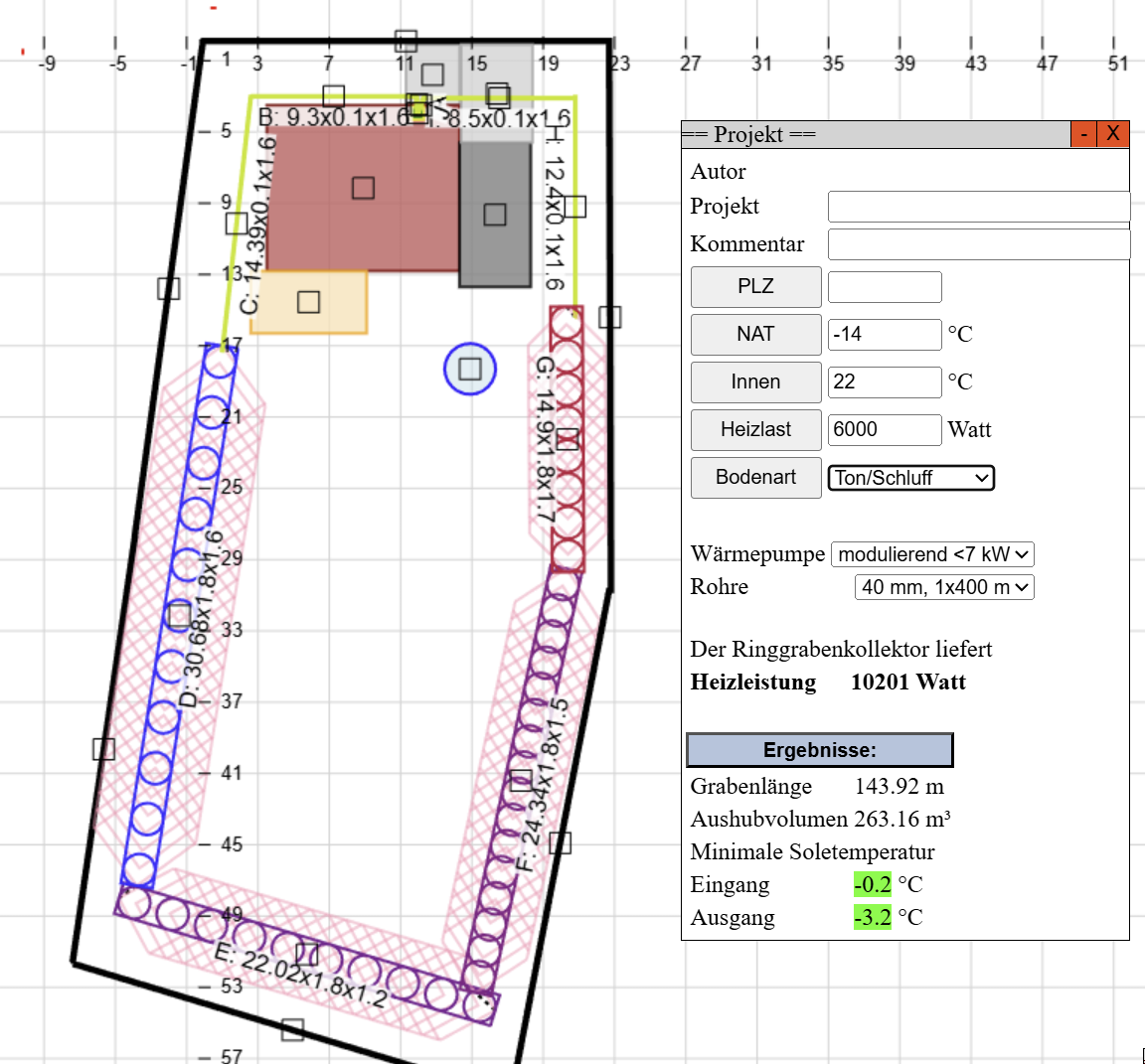 Das Wasser steht eher unten, da ist es recht niedrig und die Wahrscheinlichkeit, dass der RGK RGK [Ringgrabenkollektor] im Wasser steht am höchsten. Nach Input von @christoph1703 schaut die Planung jetzt so aus. Bei Lehm + Nässe dürfte die Leistung weit über 10kW liegen :-D ![]() |