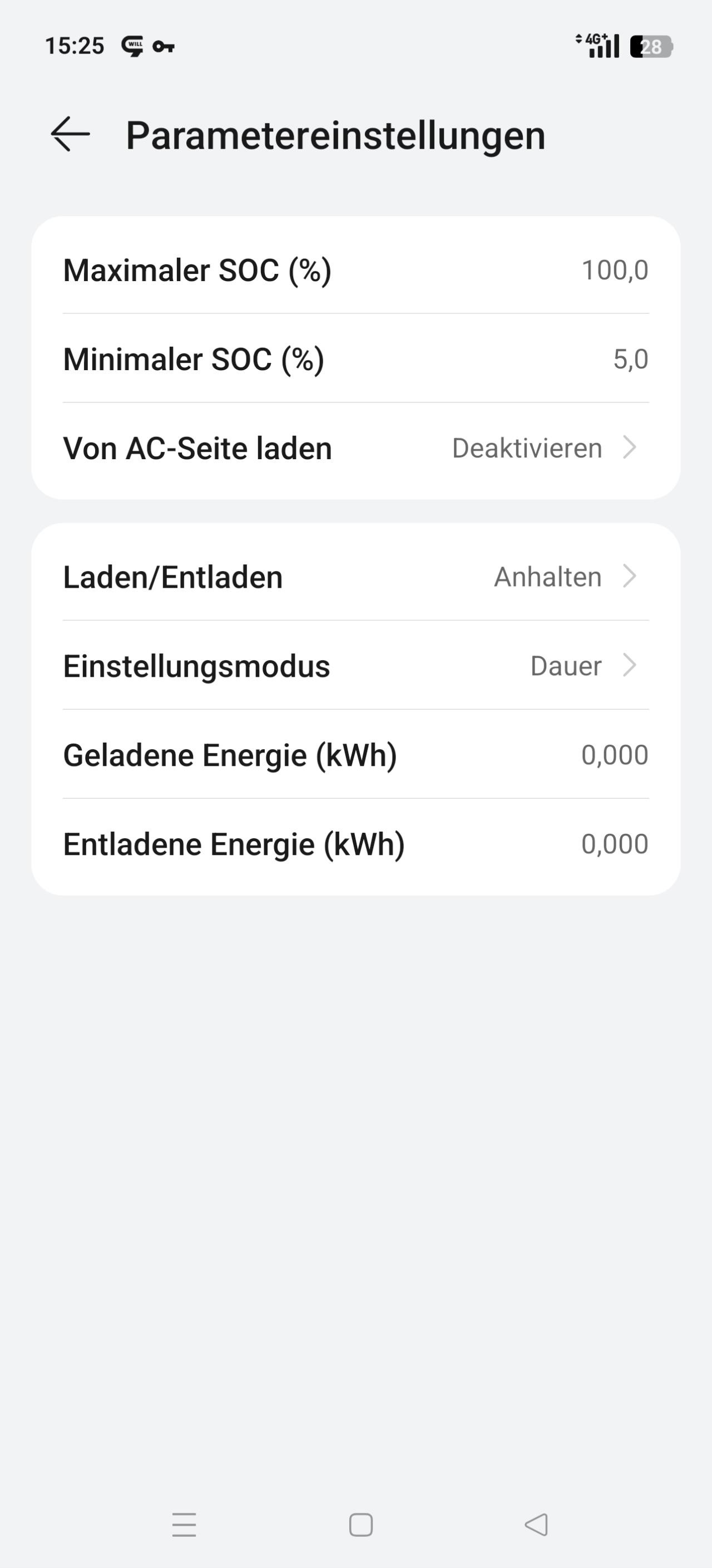 Vielen Dank für die Info! AC Laden ist offensichtlich nicht aktiv. Ich bin zwar Besitzer (=Installateur) der Anlage in Fusionsolar, sehe aber keine Möglichkeit das über die App zu ändern. D.h., ich werde mich mit der Anlage verbinden, wenn ich wieder zu Hause bin.