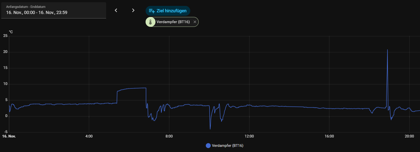 Ich habe das Diagram erweitert. Mit dem -3 Grad passt schon. Kann man denke ich gut sehen. Gegen 8 waren die 12 Stunden um? Denn da war die Verdampfertemperatur über 0.