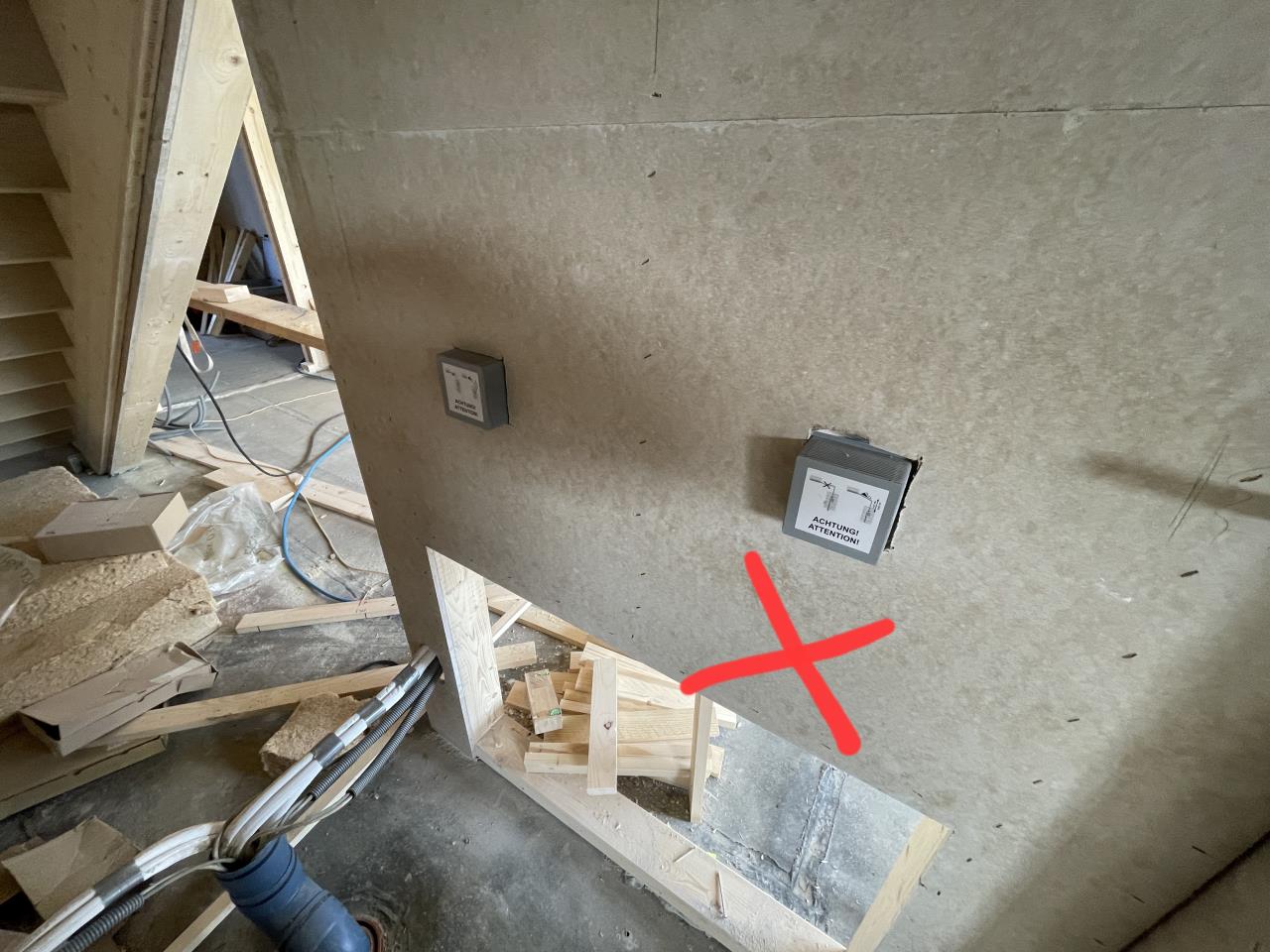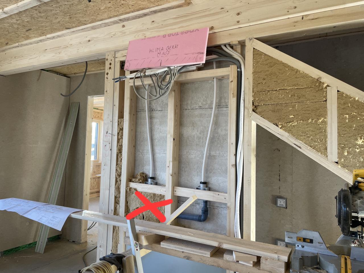 Im Spalt rechts neben dem roten Strich verläuft das Abflussrohr der Kondensatschläuche. Beim linken Kondensatablauf war die Inneneinheit, also der Siphoneinsatz nicht reingesteckt, sonder lag lose in der Wandbox drinnen, als ich sie aufschnitt.