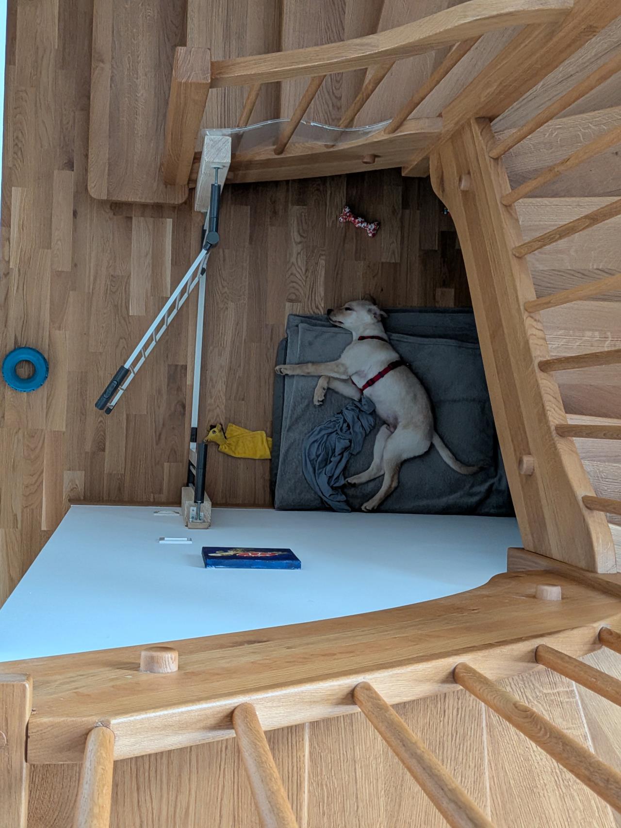 Der Hund hat sich schon recht gut eingelebt und liegt auch gerne in seinem Bereich unter der Treppe.