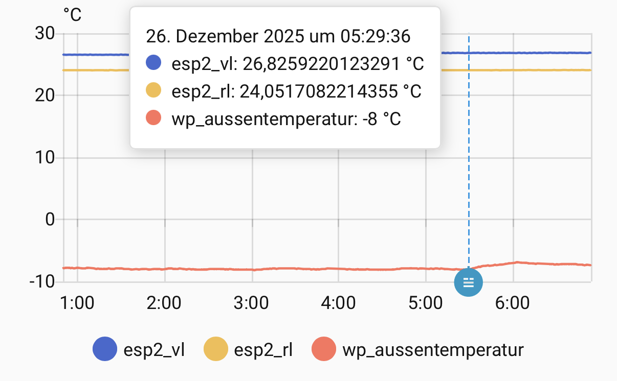 Was ist dir denn unklar bei den Rücklauftemperaturen und Spreizungen? Ich messe zwar nicht die RL RL [Rücklauf] einzelner Heizkreise, aber den gesamt RL RL [Rücklauf] ziemlich genau und der ist bei mir wie festgenagelt. Hier ein Bild einer etwas kälteren Nacht Die Heizkurve habe ich auf VL VL [Vorlauf]=27C bei AT AT [Außentemperatur]=-10C und VL VL [Vorlauf]=28C bei AT AT [Außentemperatur]=-20C gestellt. Bei -10C macht das dann ungefähr eine Spreizung von 3K, vermutlich etwas weniger. Das beobachte ich auch so in der Realität. Berhan hat glaube ich noch kleinere Spreizungen wegen seiner Hydraulik und weil seine Luft WP WP [Wärmepumpe] eine stärkere Pumpe mit mehr Durchsatz benutzt. |
