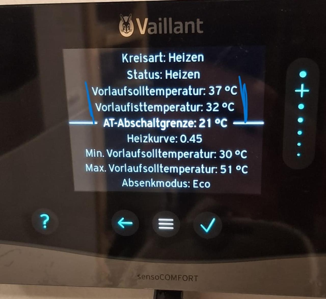 Habe nun die Temperaturen die letzten Tage nochmals beobachtet und dabei ist mir aufgefallen, dass die VL VL [Vorlauf]-Solltemperatur im Heizkörperkreis eigentlich nie erreicht wird. Im Bild blau markiert, die Vorlaufisttemperatur (laut Anzeige, auch laut Thermometer an der Leitung) weicht um einige °C ab. Die Temperatur im Pufferspeicher liegt laut Anzeige auch bei ca 32°. Wenn ich jetzt meine Erkenntnisse im Beitrag hier verwende: - Verstehe ich es richtig, dass die VL VL [Vorlauf]-Isttemperatur gar nicht höher sein kann als die vom Puffer? - Nachdem ja bei mir alles durch den Puffer fließt, gibt der Puffer de-fakto die maximale Vorlauftemperatur für die Heizkreise vor, oder? Ich habe jetzt mal am "höchsten" Punkt im Haus den Heizkörper entlüftet, war aber ehrlich kaum Luft im System. Die Temperaturfühler habe ich kontrolliert, scheinen gut zu sitzen. Habe in der Früh bereits den Flüsterbetrieb tagsüber deaktiviert, also sollte die LWP LWP [Luftwärmepumpe] nun im normalen Betrieb laufen. Woran kann es noch liegen? (abgesehen vom vorhandenen Pufferspeicher) Oder ist eine Abweichung "normal" und sollte mich nicht irritieren, solange es in den Räumen warm wird? Die Heizkurve zu erhöhen bringt mM ja auch nichts, weil eigentlich wäre ja bereits eine höhere Soll-Vorlauftemperatur. |