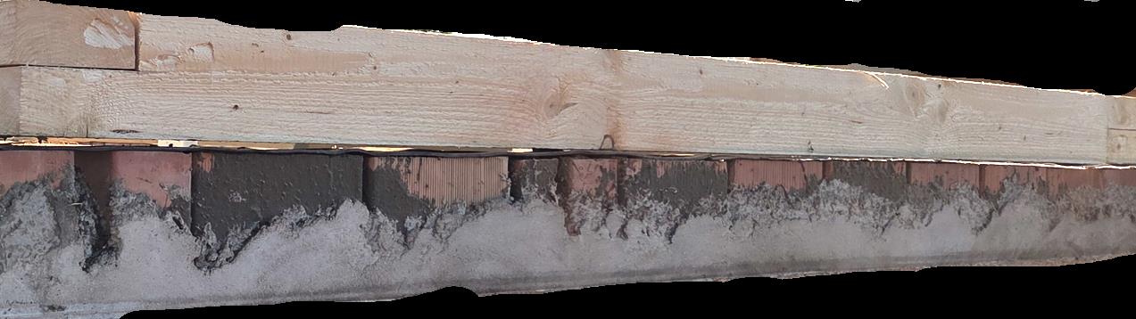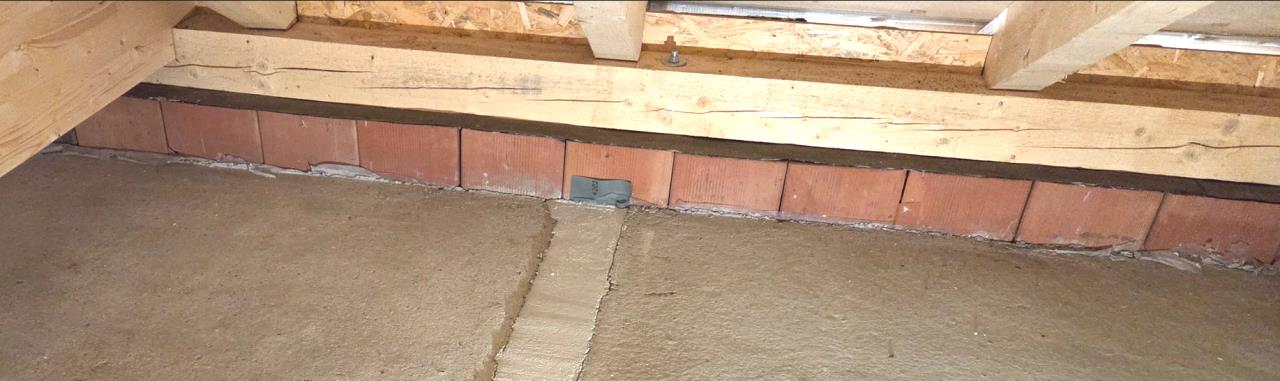 Man sieht die Mauerbank auf den unregelmäßigen Ziegeln der übermauerung (nicht) aufliegen (die wurde danach noch an vielen Stellen unterfüttert beim aufbau des Dachstuhls)