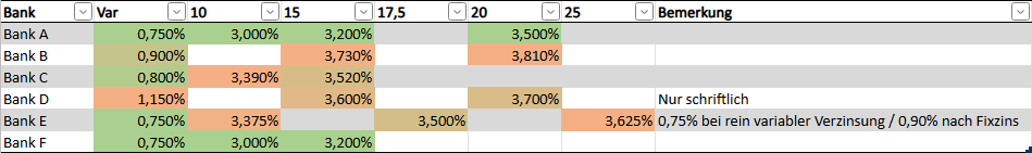 Da mir dieser Thread in der Angebotsphase sehr geholfen hat und wir nun gestern auch endlich abgeschlossen haben, möchte ich etwas zurückgeben. Hier ein Info-Post meinerseits für Referenzwerte: Gesamtkosten: ~505.000€ Eigenmittel: ~175.000€ Finanzierungsbedarf: 330.000€ Kreditgeber: Österreichweite Bank am Land Laufzeit: 30 Jahre, 15 fix Fixzins: 3,20% Danach 3M EURIBOR +0,75% Einrichtung: 1.900€ Kontoführung: 9€/Qtl Sondertilgung: 10.000€/Jahr frei, alles darüber 1% Pönale Ich weiß nicht, ob ich hier Banken namentlich erwähnen darf (da dies hier meinem Empfinden nach kaum passiert), deshalb anonymisiere ich nachfolgende Tabelle ... Hier die besten Zinssätze welche wir von 6 kontaktierten Banken erhielten, wobei angemerkt sei, dass