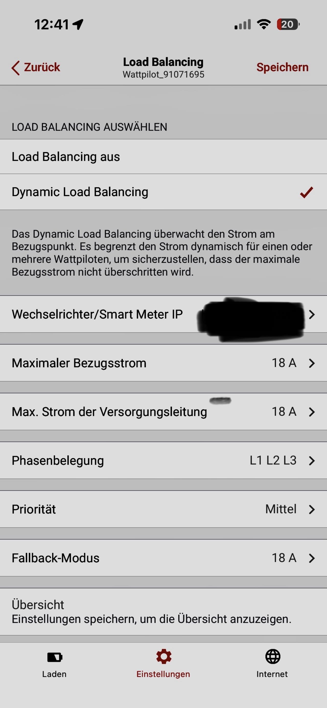 Komisch, dann muss ich irgendwas falsch eingestellt haben. Die Einstellungen vom Dyn. Load Balancing siehe Screenshot, geladen hab ich da zb dreiphasig mit 10 A oder auch testweise mit 16 A. Das heißt bei euch wird: - der Ladestrom heruntergeregelt und nicht nur die Lade komplett abgebrochen? - bei Überschreiten von 11 kW Gesamtleistung heruntergeregelt auf oder sobald eine einzelne Phase 16 A überschreitet? Ich hab es vorhin nochmal getestet und da war es so, mit 10 A (dreiphasiger) Ladung waren alle Phasen im Haus bei unter 18 A und es wurde weiter geladen. Dann habe ich den Herd dazu eingeschaltet, wodurch eine der drei Phaen die eingestellten 18 A überschritten hat, dadurch wurde die Ladung mit Hinweis auf Dynamic Load Balancing abgebrochen und wie ich den Herd ausgeschaltet hab, hat der Wattpilot wieder begonnen zu laden (mit den eingestellten 10 A). |