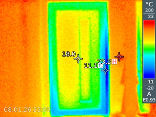Mich hätte interessiert wie ihr mit der Stellungsnahme des Herstellers umgehen würdet und ob es nun ein Mangel ist oder nicht. Er spricht ja von einer "Wärmebrücke die keinen Reklamationsgrund darstellt." Hier ein älteres Foto von der Innenansicht, damit man die Türe von Innen sieht (das Haus ist jetzt Innen bereits fertiggestellt) Habe jetzt ein Foto mit der IR Kamera gemacht. Aussentemperatur derzeit: -4°C |