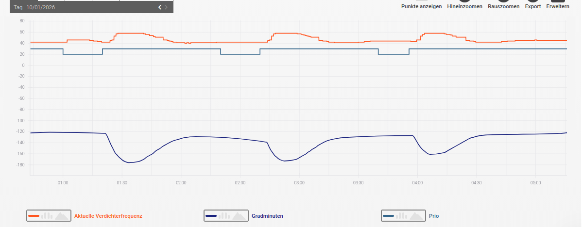 Ok, danke. Der dritte Parameter steht auf 100. Der Heizstab kommt also erst dazu, wenn der Kompressor die Gradminuten nicht mehr abbauen bzw. auf Stand halten kann. Mal beobachten, wenn es jetzt wieder -13⁰C bekommt. Die GM laufen dann NACH der WW WW [Warmwasser]-Bereitung sehr weit ins Minus, bis der Heizkreis dann wieder durchgewärmt ist. |