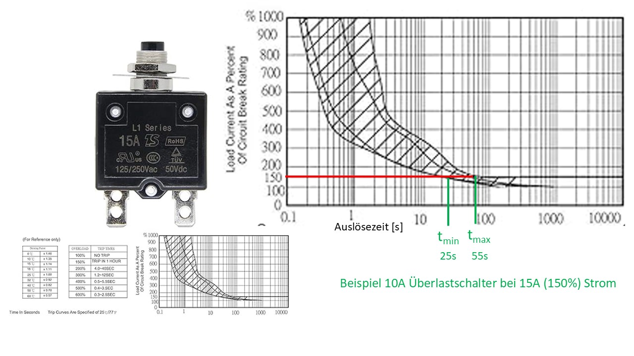 Diese Überlastsicherungen funktionieren mit einem Bimetall. Die lösen nicht sofort aus. Das hängt immer von der Überlast ab. Hier ein Beispiel von einer 10A Überlastsicherung bei einem Strom von 15A (150%). Da gibt es zwei Auslösezeiten, tmin (kann auslösen, muss aber nicht) liegt bei ca. 25 Sekunden, tmax (muss auslösen) liegt bei ca. 55 Sekunden. |