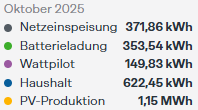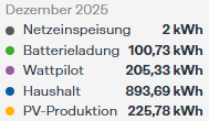 Ich glaube dir die Zahlen schon, nur noch einmal: du hattest in 12/25 anscheinend 100kWh Batterieladung - das war meine komplette Erzeugung! Entweder du heizt nicht mit Strom oder du wohnst halt besser und nicht im dauernd schlechten Osten (seit 5 Jahren geht der Ertrag im Winter nur runter, da Dauernebel). Aber das sollte man halt schon auch bedenken und nicht irgendwelche Werte aus 800m Seehöhe mit Dauersonne vergleichen. Danke für den November, gleiches Bild: meine Gesamterzeugung in 11/25 waren 307kWh, was deiner kompletten Batterieladung entspricht... |
