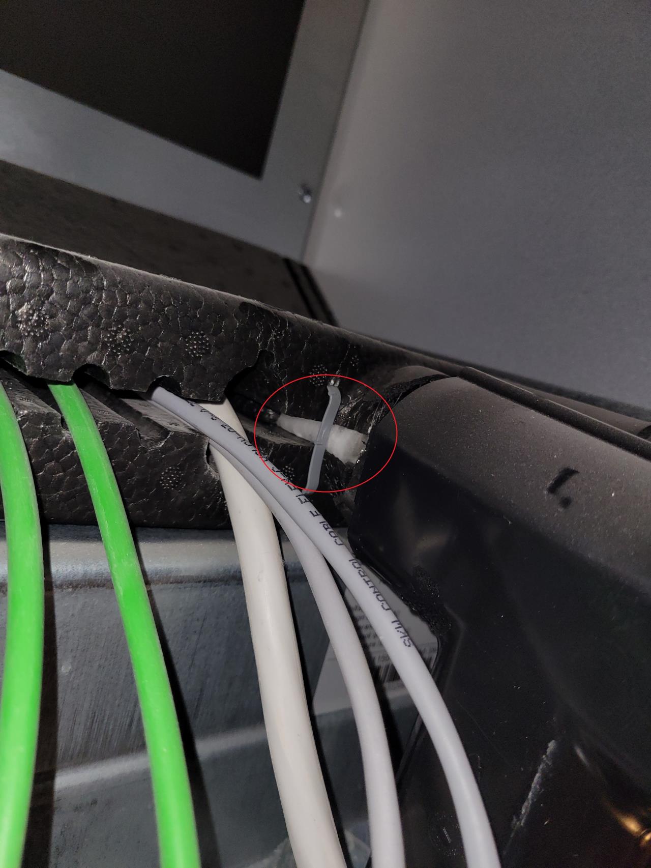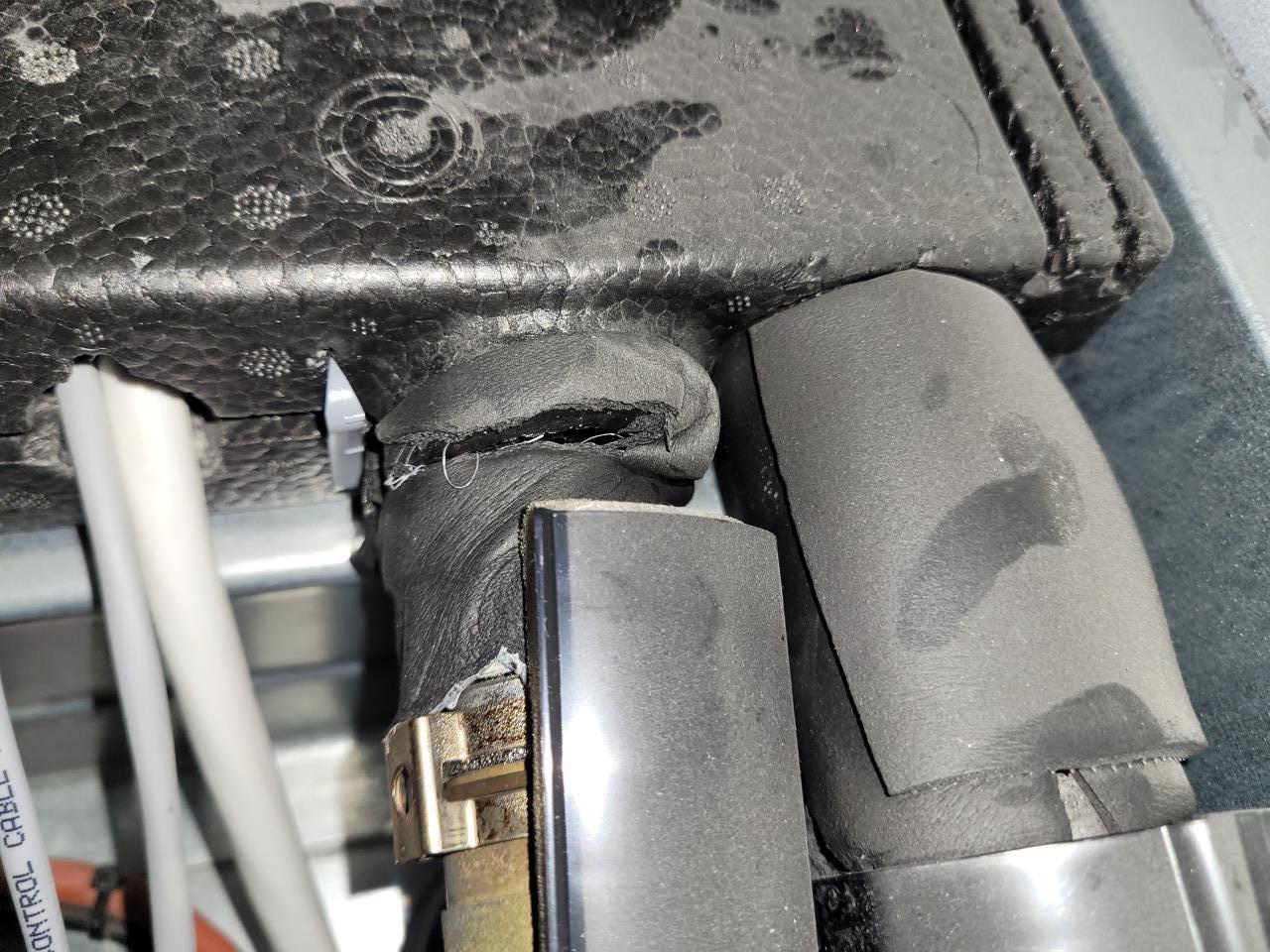 Ich habe des Rätsels Lösung gefunden. Sole aus ist komplett zugefrohren. Habe mittlerweile rausgefunden wie ich diese Rohrdurchführung/Rohrdämmung abnehmen kann. Momentann kann ich die Dämmung bei Sole aus gar nicht runternehmen, weil es angefrohren ist. Rechts ist das Sole Ein Rohr und links Sole aus: Und hier sieht man auch wo das Rohr reinkommt, dass es gefrohren ist. Wie würdet ihr vorgehen? Warten bis die Heizsaison vorbei ist, Plastikdämmung/Rohrdämmung runtergeben und mit Armaflex neu machen? Bzw. irgendeinen Fetzen in die WP WP [Wärmepumpe] reingeben, weil das Wasser rinnt mir ja ansonsten runter in die Elektronik? |