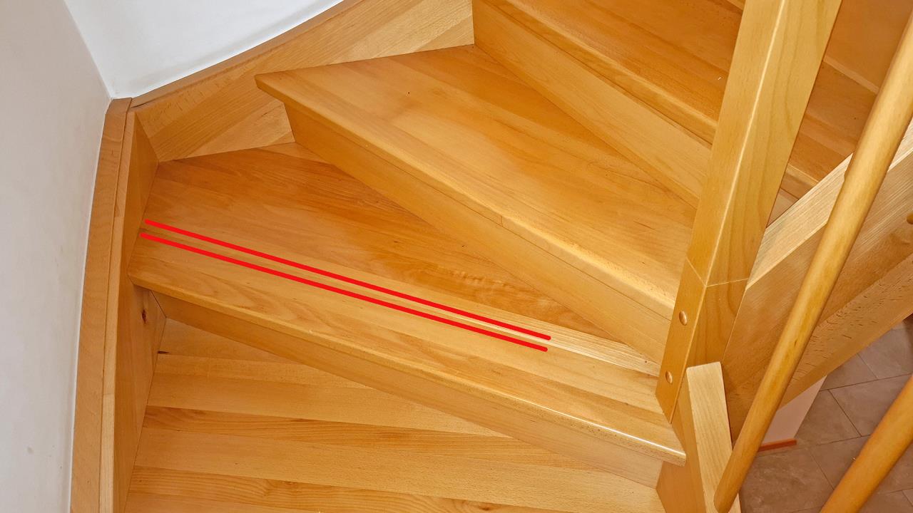 Der Riss/Bruch (=zwischen den beiden roten Linien) geht von ganz außen fast über die komplette Breite der Stufe. Lediglich die letzten ca. 25cm an der Innenseite sind (noch?) nicht gerissen.
