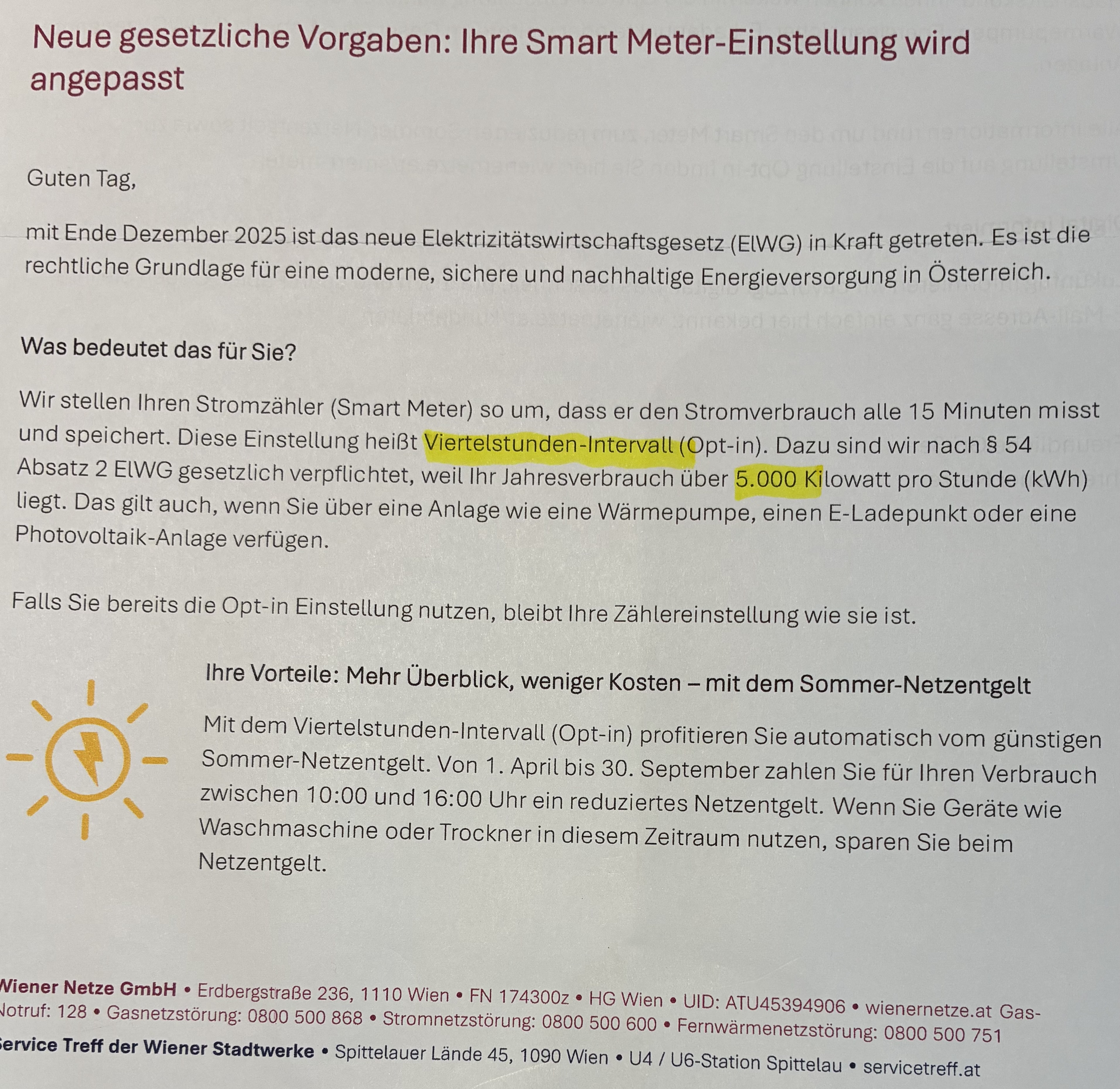 heute kam ein Brief von den Wiener Netzen - ich werde auf 15-Minuten Messung umgestellt. Die freiwillige Opt-in Variante entfällt. Es wird auf Paragraph 54 Absatz 2 ElWG verwiesen.