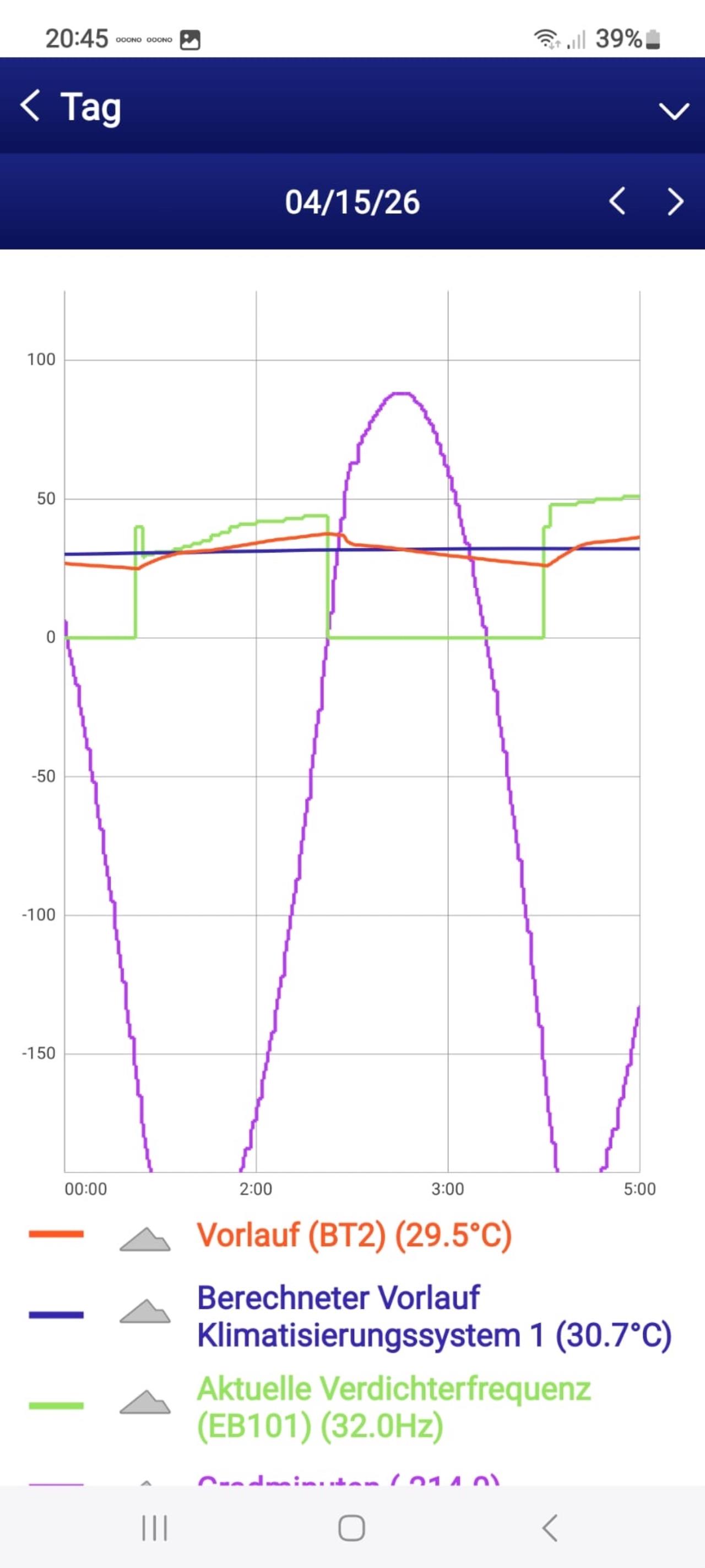 die Wärmepumpe taktet sehr viel und was mir auffällt, ist, dass die Wärmepumpe nicht richtig runtermoduliert. Sie geht nie unter 37-38Hz, obwohl sie eigentlich ja 20Hz können sollte. Der Effekt ist, dass die Gradminuten sehr schnell abgebaut werden und die